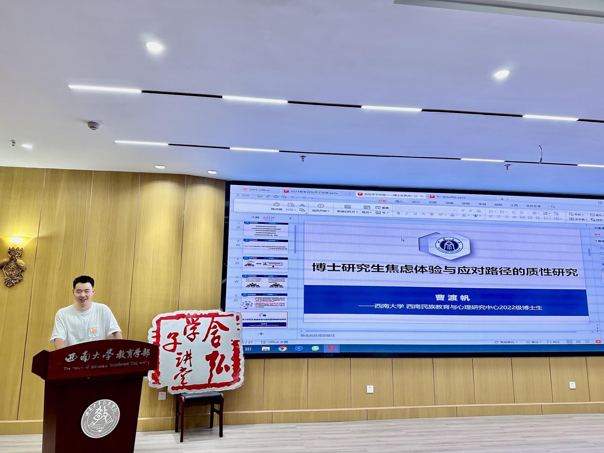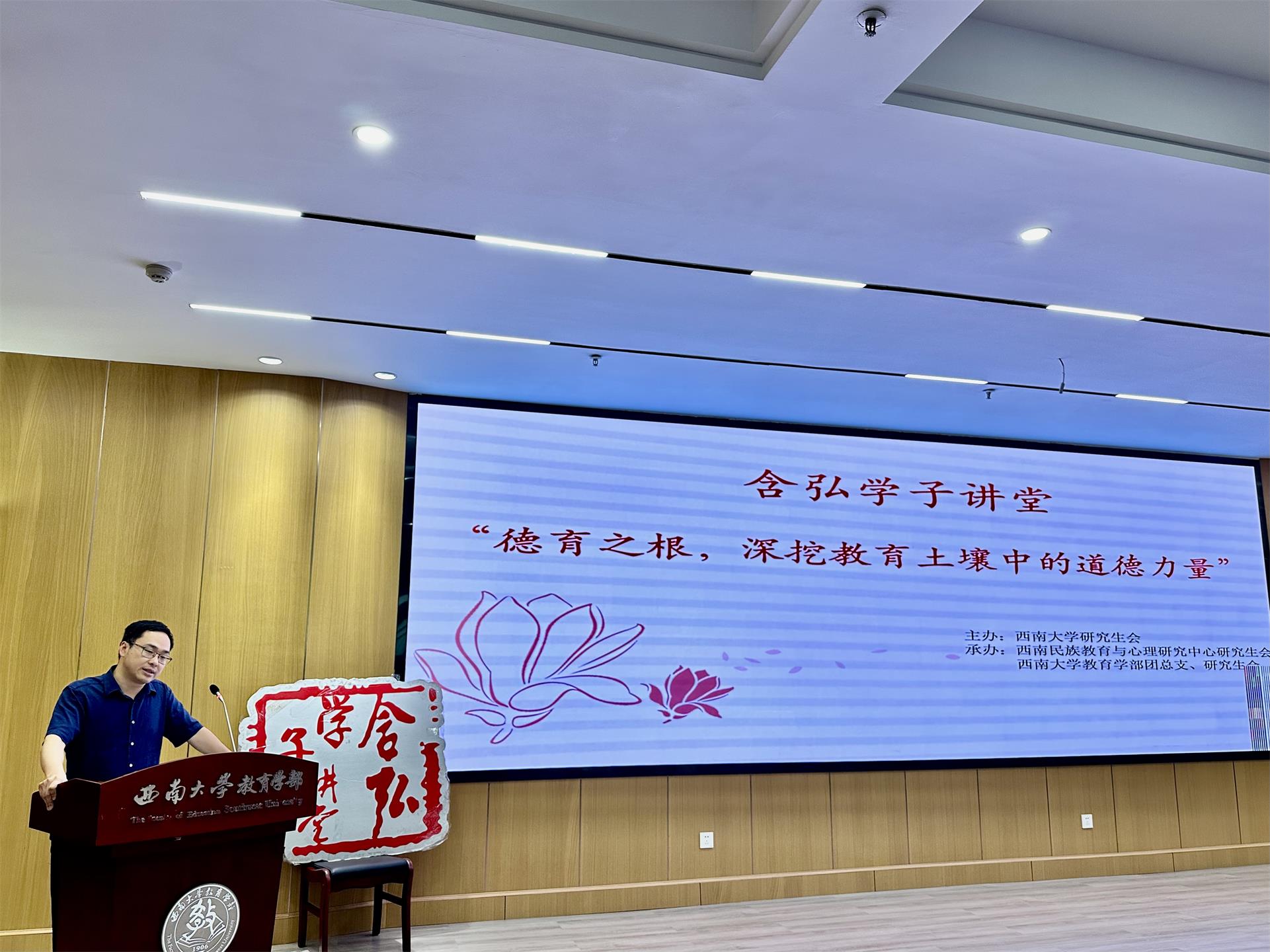 2024年5月11日,由PA视讯研究生会主办,西南民族教育与心理研究中心(以下简称“中心”)和教育学部共同承办的含弘学子讲堂之“德育之根,深挖教育土壤中的道德力量”主题交流分享会在教育学部802报告厅举行。本次活动邀请教育学部副教授吴叶林老师、教育学部副教授杨柳老师和中心副教授张健老师担任评委,邀请段欣宇、铁必杰、卞慧敏、曹渡帆四位同学进行分享。PA视讯研究生会代表、教育学部研究生会、西南民族教育与心理研究中心研究生会以及两学院研究生参加了此次活动。