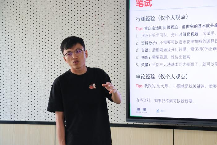 王跃分享了关于公务员考试的备考经验与感悟,他分别介绍了公务员考试考什么、怎么学、以及如何选岗的个人见解。他讲到,我们应先看视频课、做基础题来夯实根基;在此基础上,学习数量关系与申论部分来进行拔高;最后,他建议大家在冲刺阶段开始计时刷行测套题,学习申论大作文结构逻辑并积累素材,进行记录和背诵。他的分享为有意参加公务员考试的同学们提供了可行的备考方法。