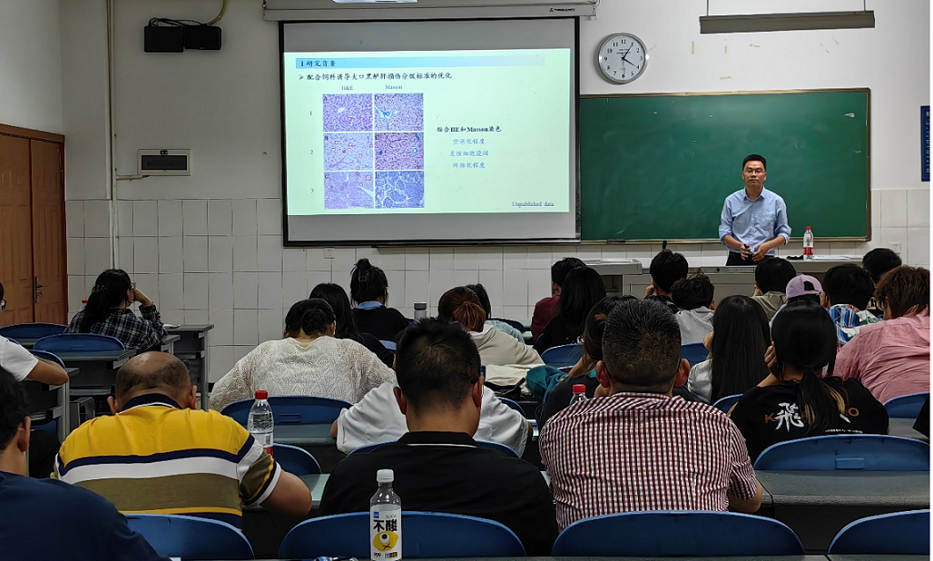 陈拥军副教授以“不同食性鱼类饲料中适宜可消化糖水平、肉食性鱼类虹鳟糖利用能力低下的原因、全程配合饲料的应用导致大口黑鲈肝脏健康问题频发”为研究切入点,分析大口黑鲈糖利用能力极其低下的可能原因。结合投喂配合饲料导致大口黑鲈肝损伤的组织学特征,介绍了其课题组构建饲料淀粉水平依赖的肝损伤模型的最新研究成果,基于组学研究剖析了高糖诱导肝损伤的潜在机制,并从分子和蛋白水平探明了投喂高糖饲料是否抑制肝脏的葡萄糖输出。