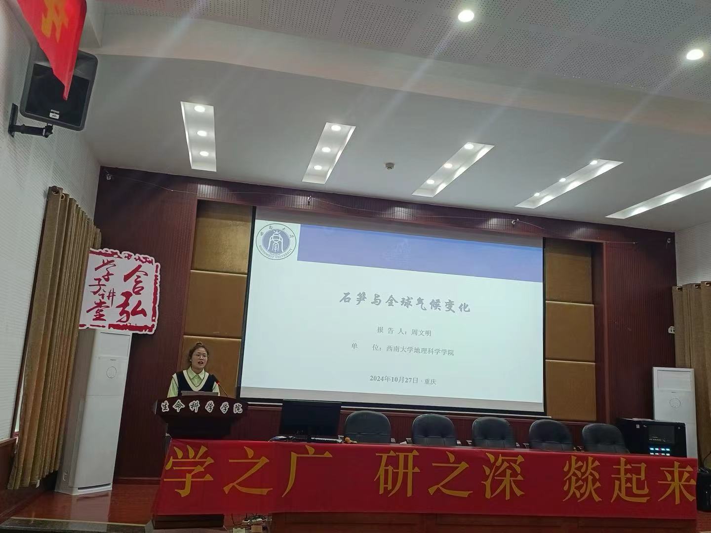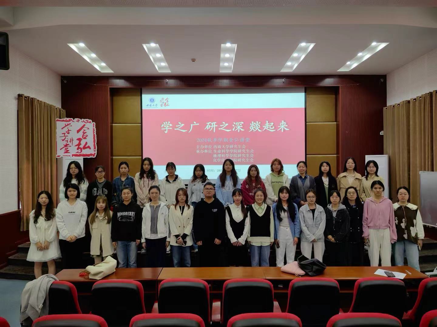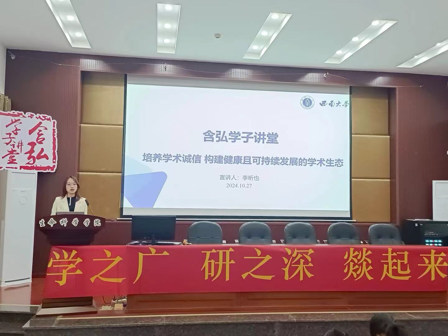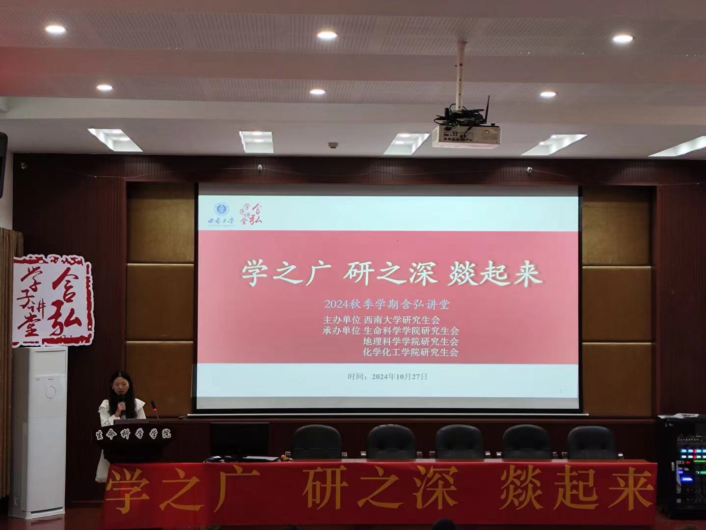 10月27日上午,含弘学子讲堂之“学之广,研之深,燚起来”学术交流分享会在生科院224会议室举行。本次活动由化学化工学院硕士研究生李昕也、生命科学学院硕士研究生刘磊、地理科学学院硕士研究生周文明、李国凤同学担任主讲人。生命科学学院、地理科学学院和化学化工学院2024级研究生参加了此次学术交流分享会。生命科学学院研究生会学术部副部长程铃馨担任主持人。