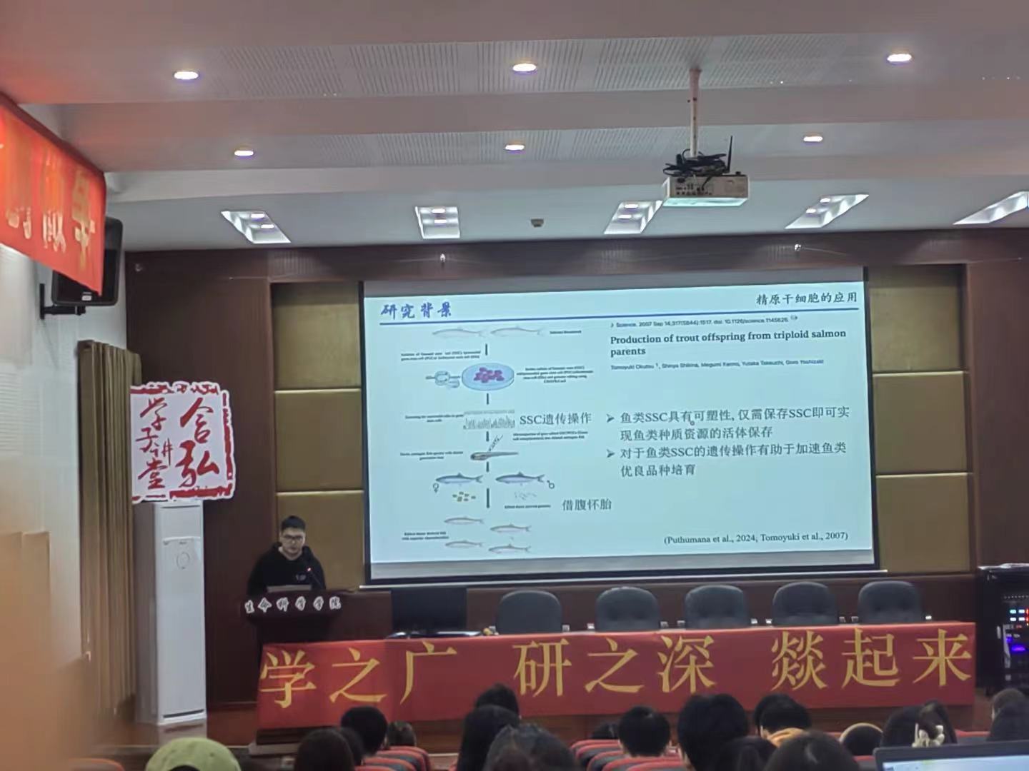 生命科学学院刘磊同学分享鱼类“gdnf/gfrα1轴在生殖发育中的功能及其机制研究”,他详细地介绍了研究背景,让参会同学了解相关知识,拓展视野,紧接着他讲述了自己是如何发现并提出有价值的科学问题——gdnfa与gdnfb在青鳉精原干细胞增殖、分化中的差异作用机制如何?gdnfa/b及其受体在其他鱼类精原干细胞的作用如何?他呼吁在场研究生和导师多交流,鼓励2024级的研究生大胆猜想并付诸实践。