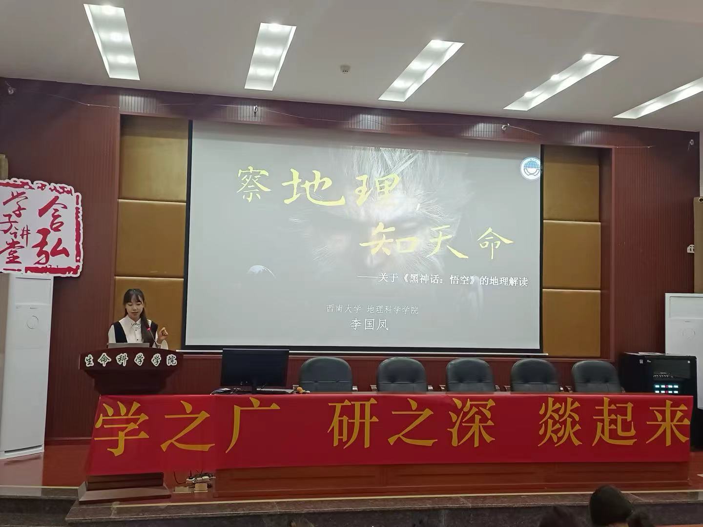 地理科学学院李国凤同学引入3A游戏黑神话悟空的视频,分享关于《黑神话:悟空》的地理解读,她将人文地理与社会经济相联系,从市场、产品、运营三个方面分析《黑神话:悟空》游戏爆火的原因,同时提到自媒体的关键影响。