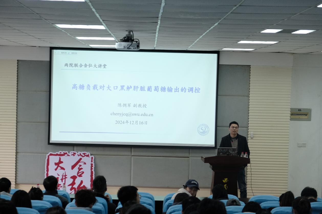 陈拥军副教授以“高糖负载对大口黑鲈肝脏葡萄糖输出的调控”为主题,全面梳理了大口黑鲈肝脏葡萄糖输出的营养调控相关研究的最新进展,为深入揭示大口黑鲈糖代谢的内在规律以及优化其养殖过程中的营养管理策略提供坚实的理论基础和实践指导依据。陈老师的分享展现了科研的魅力与价值,加深在座研究生对生命科学复杂性的理解,为以后的科研道路奠基。