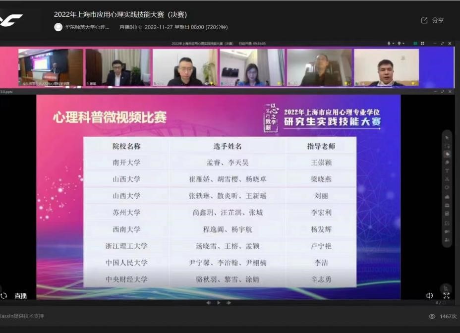2022年上海市应用心理专业学位研究生实践技能大赛是由全国应用心理专业硕士教学指导委员会指导,上海市应用心理专业学位研究生教育指导委员会主办,由华东师范大学心理与认知科学学院与上海交通大学医学院附属精神卫生中心承办的全国性专业比赛,在心理咨询面谈技能比赛中全国共有79所高校、118名选手参加;而参与心理科普微视频比赛评选的优秀作品众多,竞争亦是十分激烈。