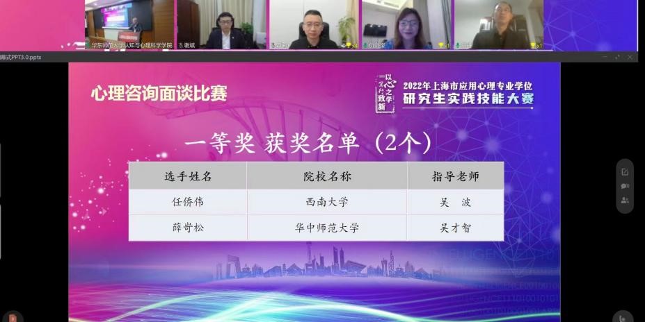 11月27日,2022年上海市应用心理专业学位研究生实践技能大赛决赛完满结束。此次比赛分为心理科普微视频比赛与心理咨询面谈技能比赛两个子项目。在心理咨询面谈技能比赛中,2021级应用心理专业硕士研究生任侨伟同学在学部吴波老师的指导下表现出色,一路过关斩将,荣获一等奖。在心理科普微视频比赛中,由杨发辉老师指导的《疫情“心”指南》作品(程逸阗、杨宇航同学)在决赛中荣获三等奖。