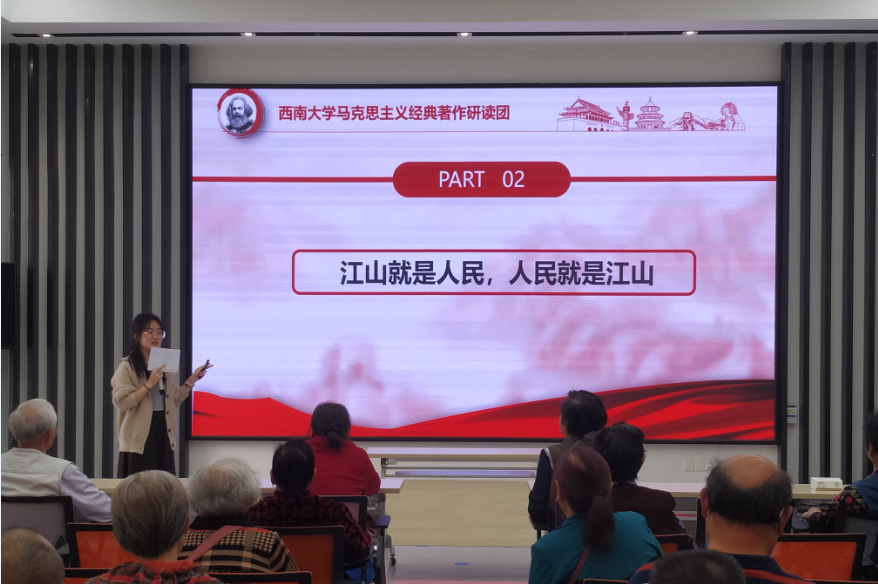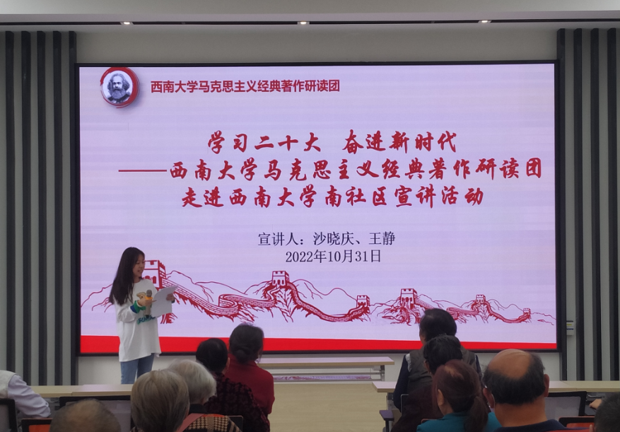 为学习宣传贯彻党的二十大精神,践行马理论学科青年学子使命与担当,10月31日下午,PA视讯马克思主义经典著作研读团到PA视讯南社区宣讲党的二十大精神。社区20多位居民参加了本次宣讲活动。研读团成员沙晓庆、王静负责本次宣讲。