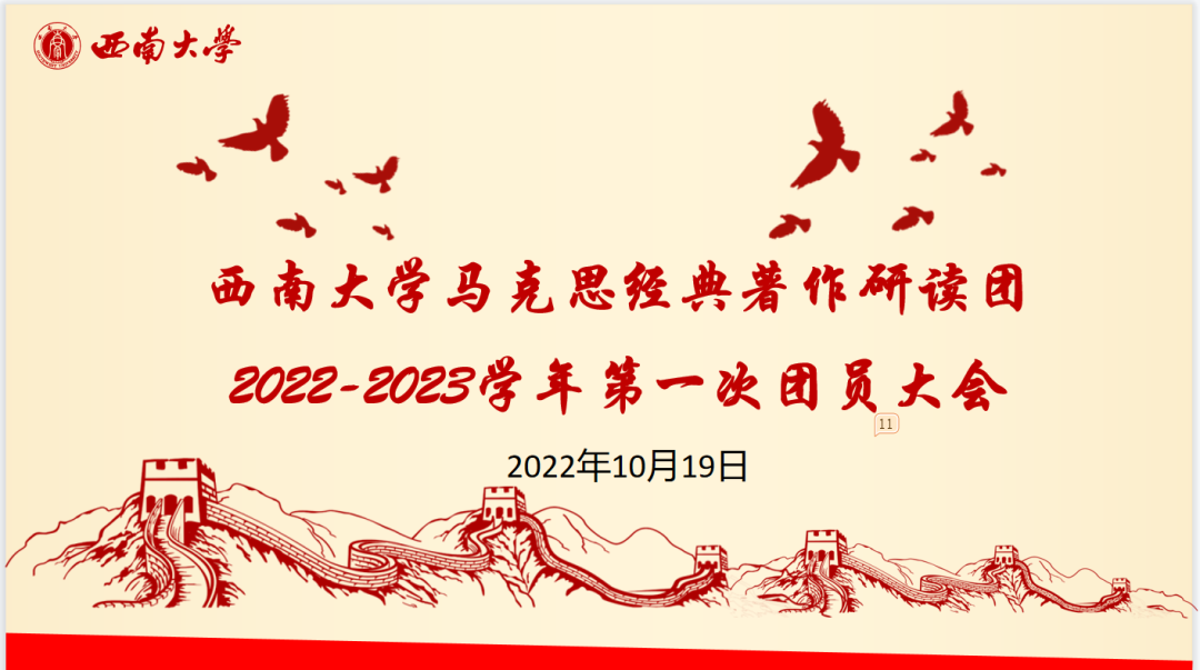 为全方位、高起点启动党的二十大精神宣讲工作,加强马克思主义经典著作研读团内部的凝聚力和向心力,使研读团新成员更加深入地了解各部门的主要职能和工作安排,10月19日下午,PA视讯马克思主义经典著作研读团2022-2023学年第一次团员大会于马克思主义学院501顺利举办。学院党委副书记、纪委书记刘东升和学院研究生辅导员王飒出席会议,研读团全体成员参加了本次活动。本次团员大会由研读团成员张志莹主持。