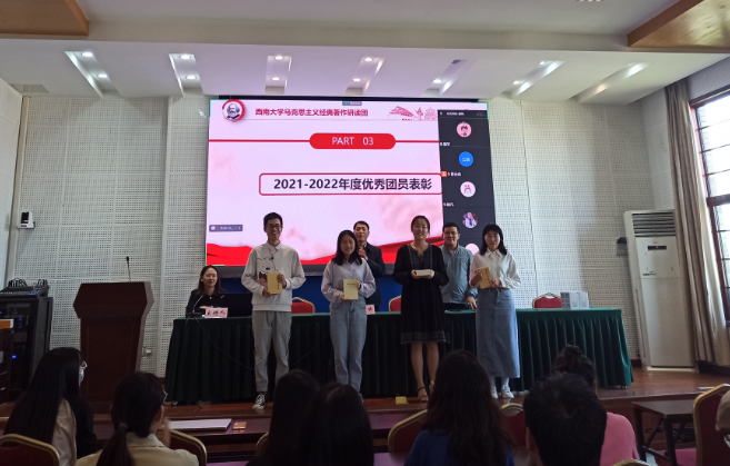 颁奖完毕,研读团成员朱红作为优秀社团成员代表进行发言。朱红同学分享了自己在研读团活动中的收获与喜悦,勉励各位新老团员积极参与、共同进步。研读团上一届成员石少华和研读团新成员代表赖舒涵依次进行了发言,两位同学的发言既有老生在一年中参与研读团活动的经验分享与对新生的勉励,也有新生在开学之初的迷茫与不安,两人的发言共同表达了通过研读团活动提升自我的追求和对研读团后续活动开展的期待。