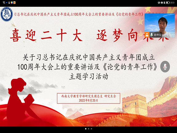 为深学笃用习近平总书记关于青年工作的重要思想,深入学习习近平总书记在庆祝中国共产主义青年团成立100周年大会上的重要讲话精神,不断提升学生骨干的综合素质和服务能力,以实际行动迎接党的二十大胜利召开。2022年9月25日20:00,PA视讯教育学部研究生团总支研究生会特举办“喜迎二十大 逐梦向未来”关于习近平总书记在庆祝中国共产主义青年团成立100周年大会上的重要讲话及《论党的青年工作》线上主题学习活动。参与本次学习活动的人员有教育学部2022级研究生辅导员、研究生团总支研究生会指导老师王潇老师以及2022届研究生团总支研究生会全体成员。组织部负责人张御龙担任主持。