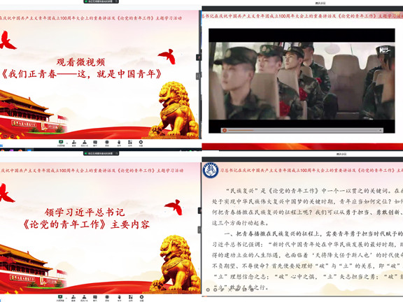 本次学习活动共计四个议程:第一项为集中学习习近平总书记重要讲话内容;第二项为学习《论党的青年工作》相关内容;第三项为线上知识竞答比赛;最后一项为王潇老师总结发言。