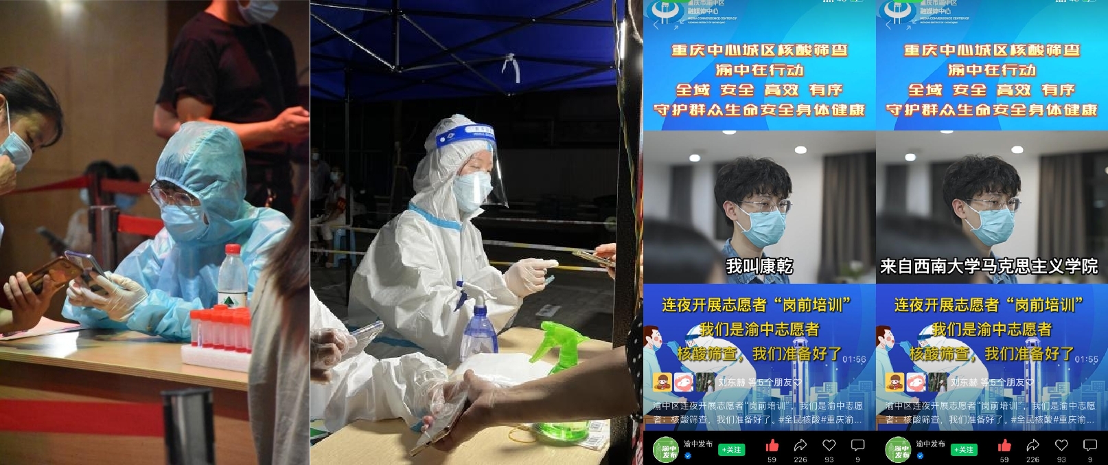 从7月底开始,重庆陆陆续续出现了新冠肺炎确诊病例,从一个区到多个区,从几例到几十例。面对复杂严峻的疫情防控形势,我院2021级硕士研究生向桂英同学和康乾同学积极响应社区的号召,分别在重庆市大渡口区和渝中区参与社区核酸采集志愿服务活动,为中心城区的全员核酸检测贡献出青年学子的一份力量。两位同学服从社区工作安排,在烈日下、在高温中、与抗疫事业共进退。他们星行夜归,天还没亮就已经去到核酸检测点,穿上密不透风的防护服,戴上口罩和护目镜参与物资的搬运、场地的布置等工作,配合所在社区完成了数千人的核酸采集工作,直到凌晨才带着汗水和疲惫回家休息。