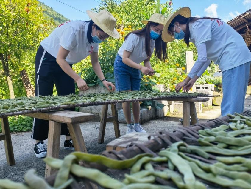 当前正值四季豆成熟收获的时期,当地农户通常会将未能及时食用的四季豆晾晒成四季豆干蔬,以便长期储存。实践队员们按照农户的指导,首先挑出较好的四季豆,去掉豆茎,用水洗净,之后放入沸水中煮熟,待其冷却后,将其置于阳光下暴晒成干。实践队员们亲身体验四季豆干蔬的制作过程中,从“学模学样”到“像模像样”。他们不仅认识到四季豆的生长规律和干蔬四季豆的制作方法,也从农户身上学习到淳朴、勤奋、务实、肯干的优秀品质。