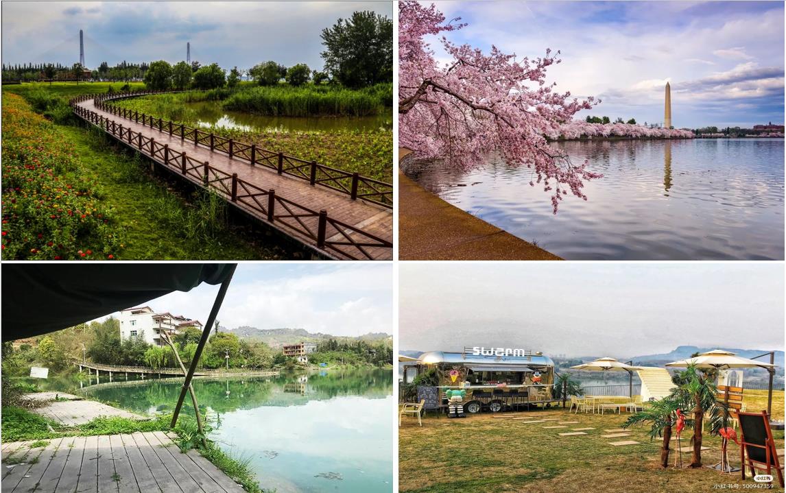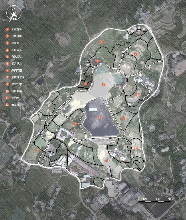 植物搭配上,为凸显场地景观特色、彰显水库四季景观,根据植物特性并结合当地生态环境,可在道路两旁设计种植栾树、红枫、乌桕、桃树、樱花等彩色树种。“幽兰花谷”大面积种植波斯菊、孔雀草、黑心菊、百日草、薰衣草、郁金香等花卉,“花田漫步”则引进映山红作为主要观赏树种,适当搭配本土树种。
