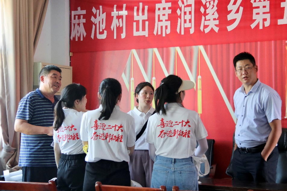 首先,队员们对村支部领导干部们的热情接待表示衷心感谢,向他们介绍了本次实践活动的流程安排,并询问了麻池村的基本情况。村支部书记介绍,麻池村正在从昔日的贫困村向宜居的新农村转型,且取得了较好的阶段性成效。自脱贫攻坚工作开展以来,麻池村旧貌换新颜,村书屋、新时代文明实践中心等民生项目不断升级,村民素质不断提高,村风民风不断改善,老百姓的获得感、幸福感大幅提升。