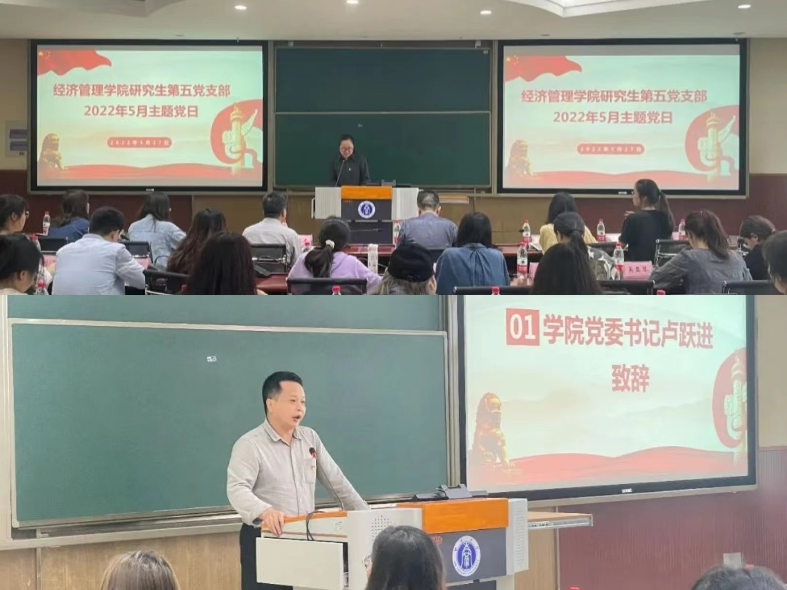 卢跃进为本次活动致辞。他强调,规范开展支部主题党日是贯彻落实全面从严治党要求,严格“三会一课”制度,加强党员教育管理的有效途径。他指出,作为校级样板党支部培育创建单位,要以“主题党日”活动为载体,切实提升支部凝聚力和战斗力,发挥好支部战斗堡垒作用。他希望,支部成员认真学习贯彻习近平总书记在中国人民大学考察时的重要讲话精神和在庆祝中国共产主义青年团成立100周年大会上的重要讲话精神,不负韶华,不负时代,不负人民,在青春的赛道上奋力奔跑,争取跑出当代青年的最好成绩。