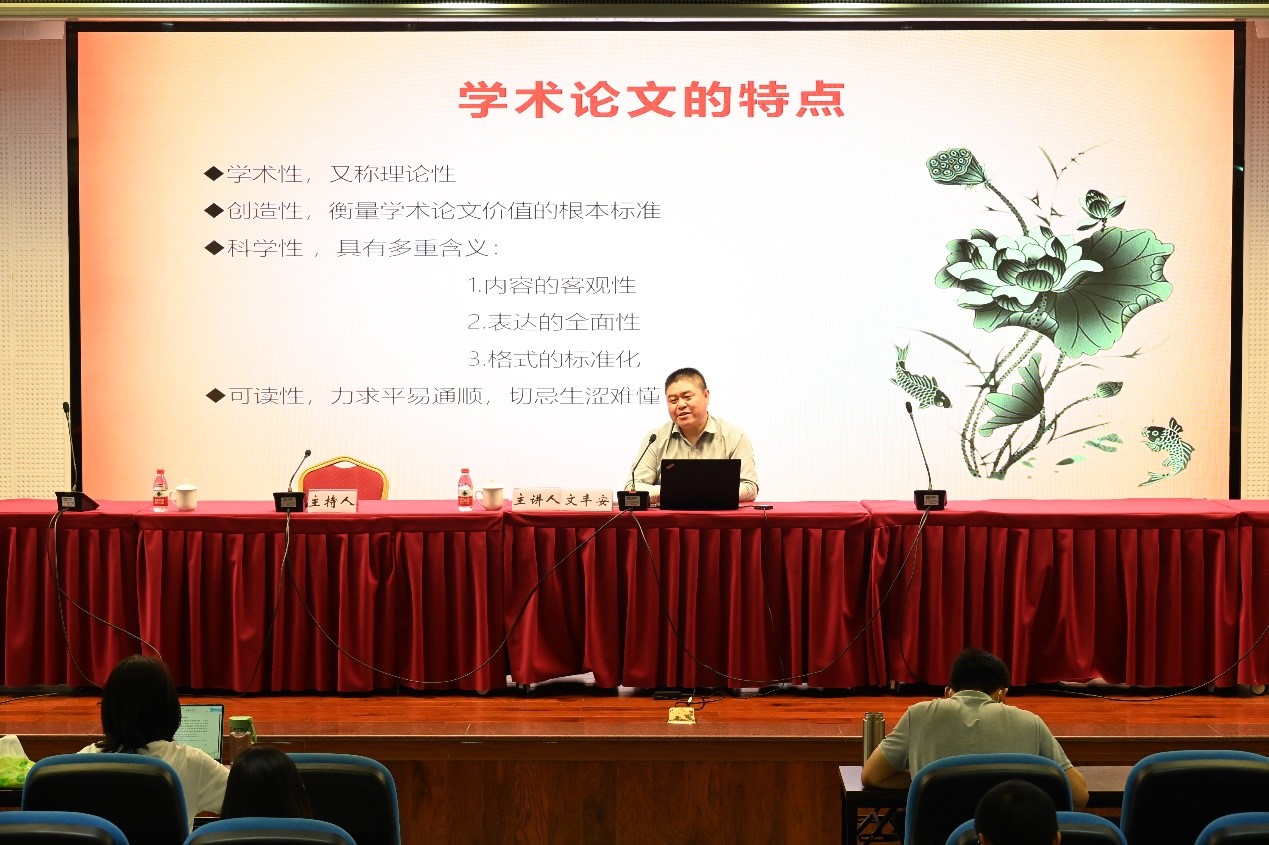 文丰安教授从论文选题、材料准备、写作过程以及论文的规律和格式等四个方面进行了生动细致的讲解,为学院师生上了一堂高质量的论文写作指导课。