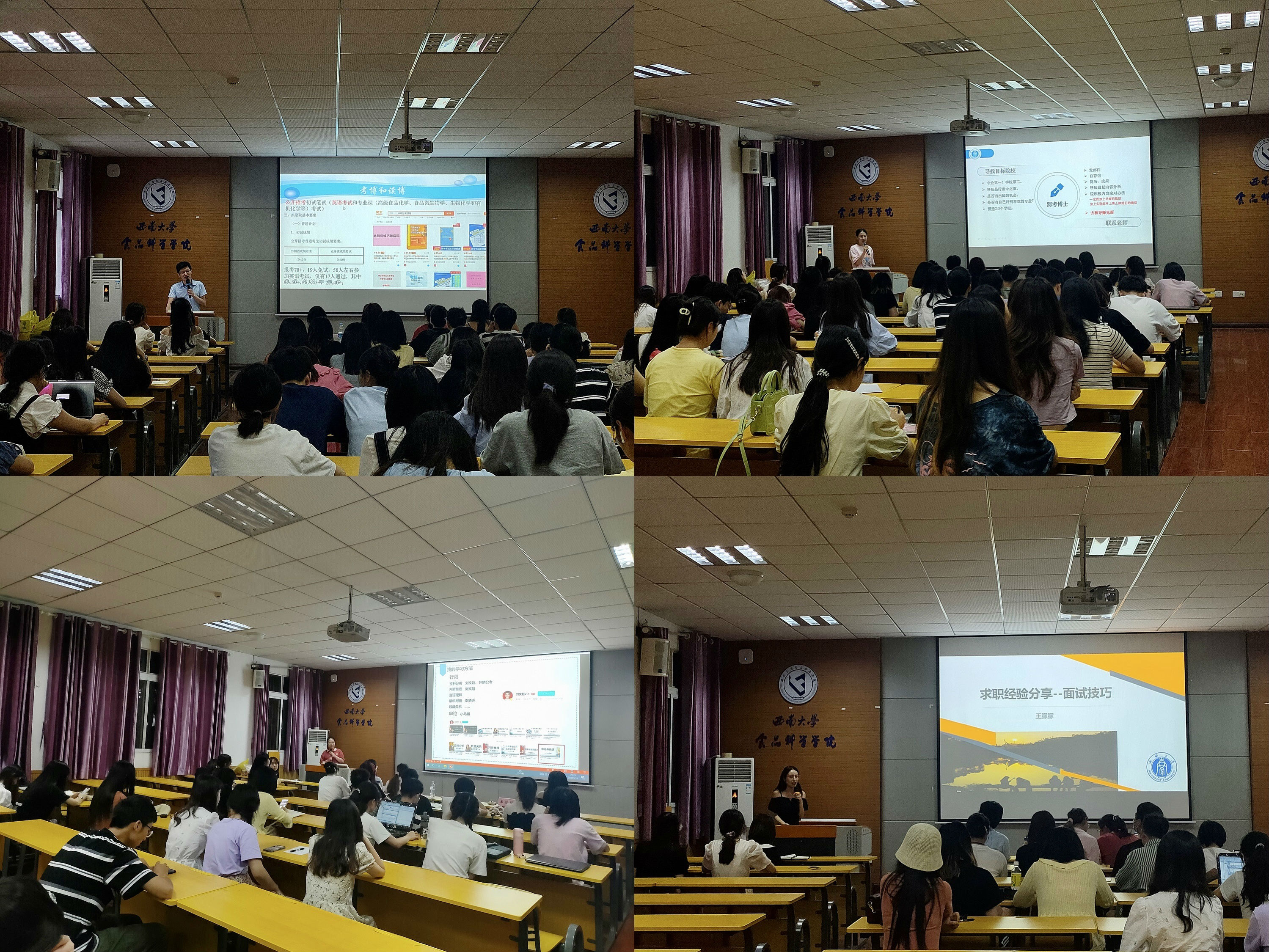 交流会上,2019级毕业生党员王智荣博士详细介绍了申请硕博连读条件、公开招考内容,并强调了选择学校、专业和导师时的注意事项。之后,2020级食品包装工程专业的何悦党员主要介绍了跨专业考博经验,向师弟师妹们讲解了跨专业考博的具体流程:寻找目标院校—联系老师—准备资料—正式报名—资料审核及面试。随后,2019级食品科学专业的赵萌党员分享了自己的考公心得,根据公务员考试的具体题型介绍了自己每个板块的学习方法,并推荐了相关网课老师及学习平台。接着,2019级食品加工与安全专业王朦朦同学以自身举例,向在场的研究生师弟师妹们分享面试技巧,介绍了简历投递、线上测评、签订三方三个阶段的成功秘诀。每位毕业生分享完毕后,观众席踊跃提问,经验分享人热情解答,互动性极强,场面热烈,同学们收获颇丰。