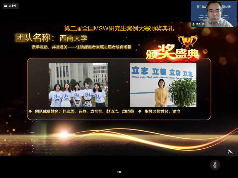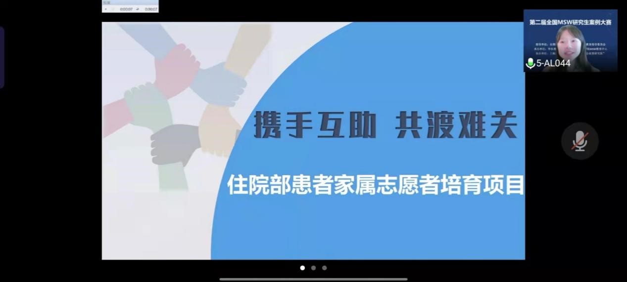 我校国家治理学院谢艳老师指导的,社会工作专业硕士研究生包晓霞、石晶、袁恬恬、赵诗洁、周晓蓉申报的案例《携手互助,共渡难关——住院部患者家属志愿者培育项目》以初赛第五名的优异成绩晋级决赛,并在决赛中荣获一等奖。
