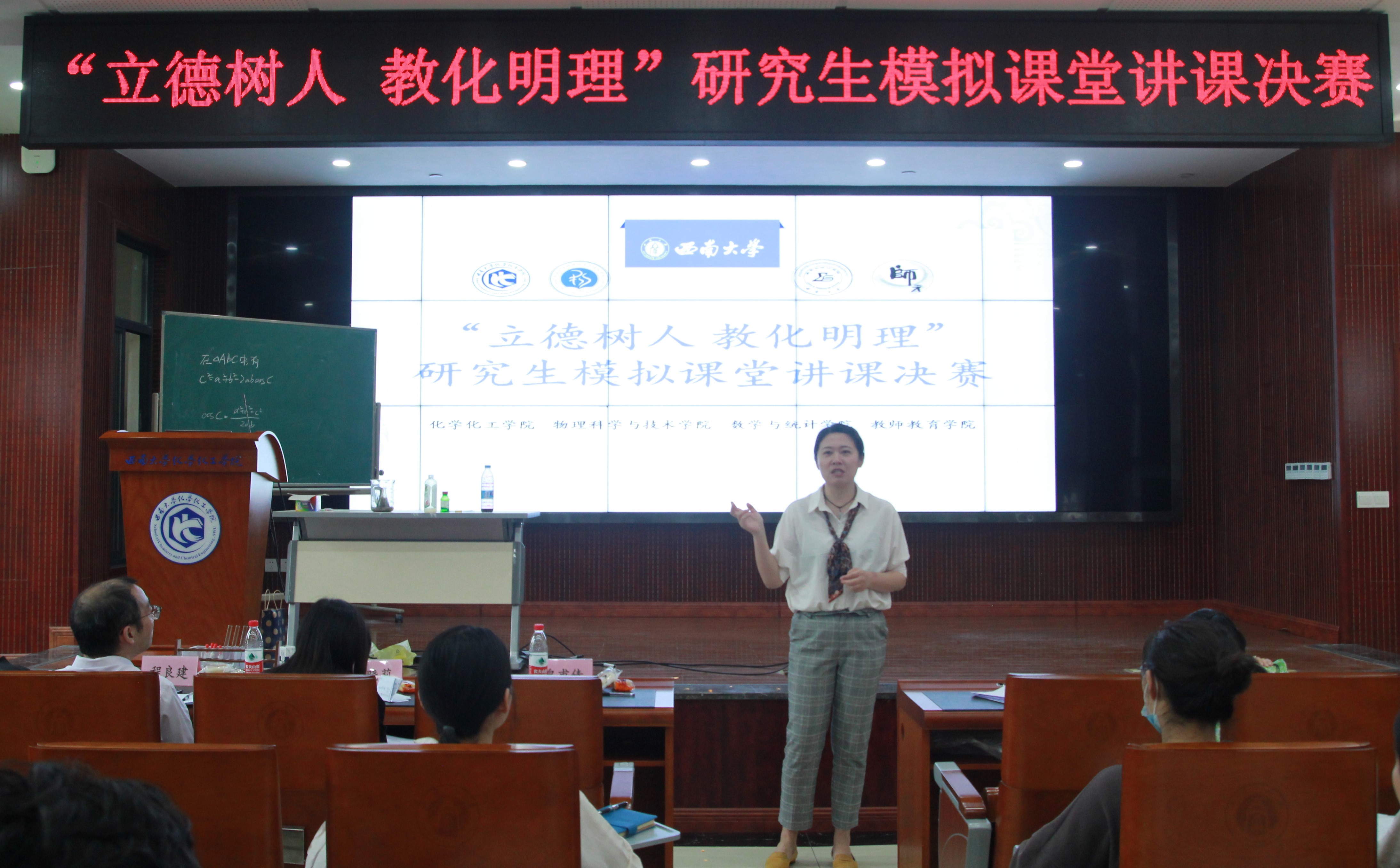 为锻炼研究生的交流能力,促进研究生综合素质和核心素养的提升,PA视讯化学化工学院联合物理科学与技术学院、数学与统计学院、教师教育学院于2022年4月23日上午在化工与药学实验大楼B114举办了“立德树人 教化明理”研究生模拟课堂比赛决赛。经过前期的激烈角逐,共有非专业组18名同学和专业组3名同学进入此次研究生讲课比赛决赛。出席本次活动的嘉宾有教师教育学院皇甫倩老师、物理科学与技术学院陈晓莉老师、数学与统计学院程良建老师、研究生辅导员杨思清老师。