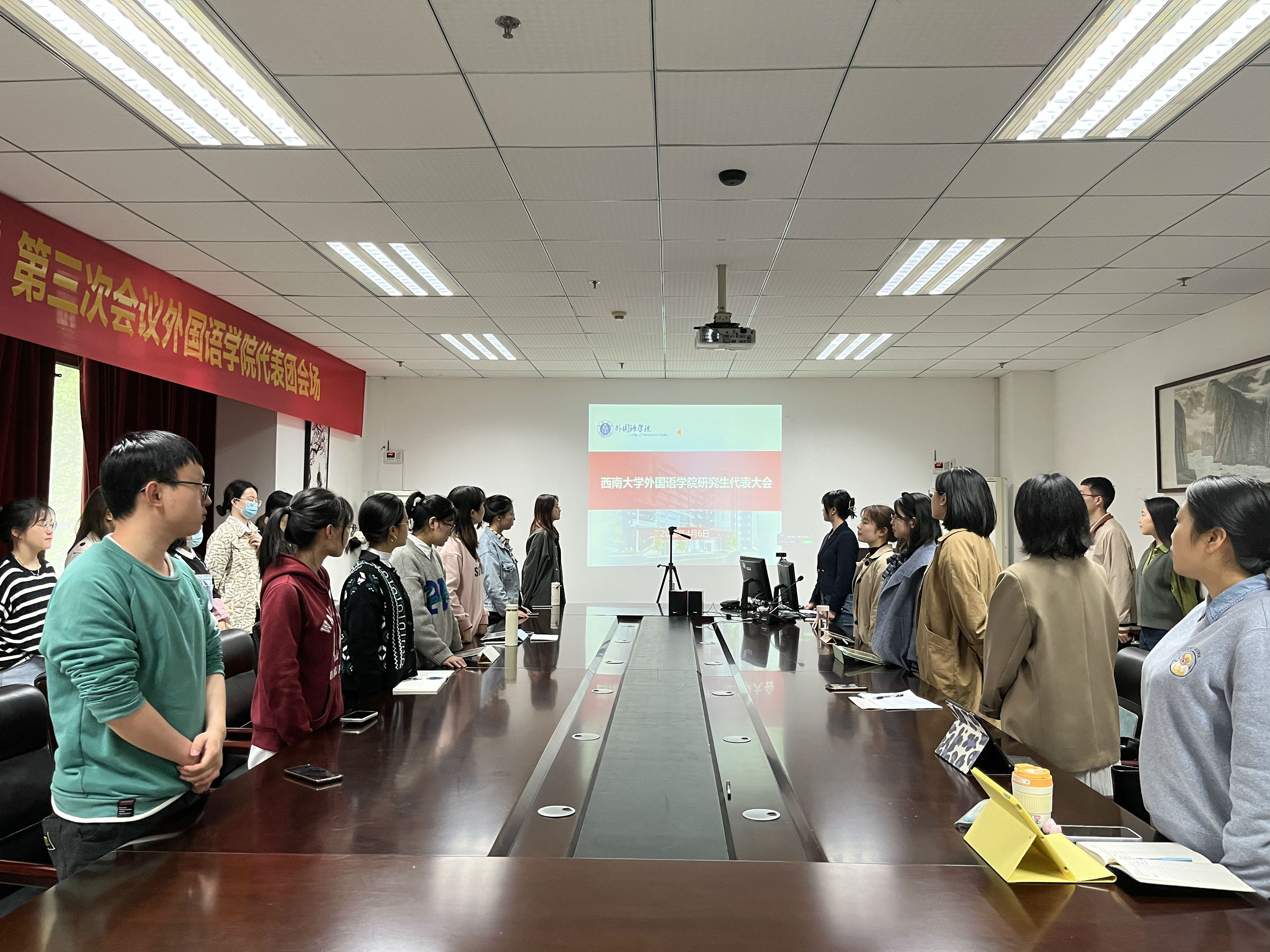4月6日中午1点,外国语学院研究生代表大会于313会议室顺利召开。外国语学院研究生会主席团、各部门部长,以及30余名研究生代表到场参加了会议,在外实习的部分干部线上参加了此次会议。会议由研究生会组织部干事黄梦源主持。