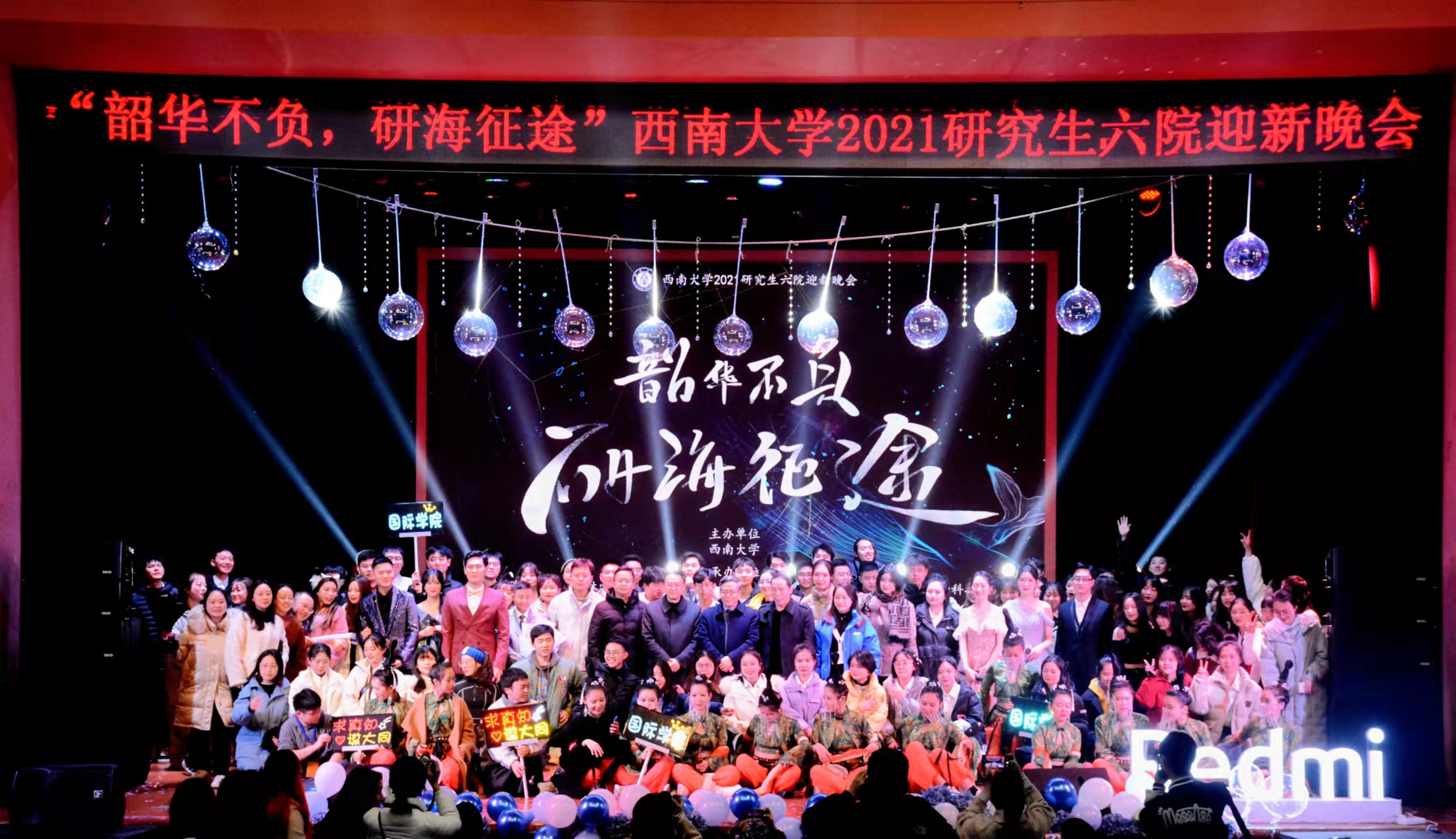 最后,在六院同学合唱的《同一首歌》中,晚会逐渐拉上帷幕,所有领导嘉宾与演职人员上台合影。“少年不惧岁月长,韶华不负少年强”。在这个舞台上,六院的少年学子们以曼妙的舞姿舞出青春风采;以动人的旋律唱响青春华章;以趣味的表演演出青春样貌。至此,“韶华不负·研海征途”2022六院联合研究生迎新晚会在歌声与欢笑语中圆满落幕。