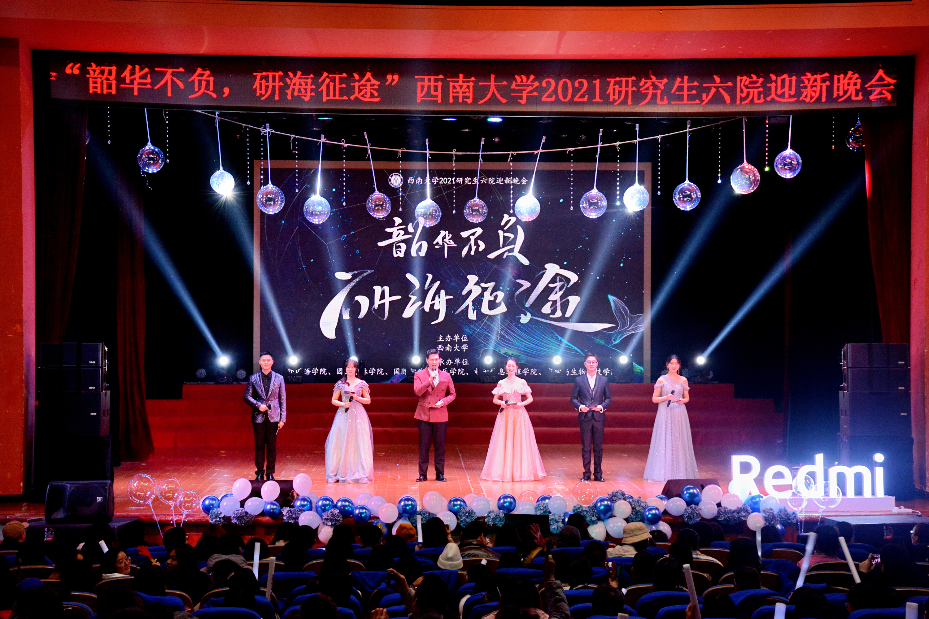 由外国语学院主办,国际学院、园艺园林学院、电子信息工程学院、音乐学院、农学与生物科技学院协办的“韶华不负·研海征途”2022六院联合研究生迎新晚会于12月16日19:00在PA视讯光大礼堂隆重举行。外国语学院院长、党委副书记文旭,党委副书记张琨,研究生导师代表罗益民、郭方云、龚志维、段芸、王莲涔,研究生辅导员向源、董典;国际学院党总支书记刘猛,学工办主任杨昆,研究生教师代表邱睿、陈晨,研究生辅导员汪鑫阳;音乐学院研究生辅导员向晓慧;电子信息工程学院党委书记毕均明;农学与生物科技学院党委书记阳义健,院长吕典秋、副院长卢坤;园艺园林学院党委书记李雪梅等领导老师莅临晚会现场,与研究生同学们欢聚一堂,迎新生,贺新年!另外,国际学院院长刘承宇也通过发送视频的方式为本次晚会致辞。(以上排序按照学校官网教学单位顺序,不分先后)