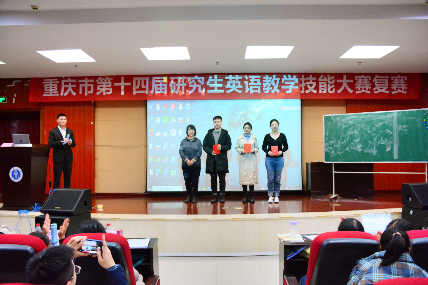 11月26日下午3点30分,重庆市高校第十四届研究生英语教学技能大赛(PA视讯赛区)复赛于外国语学院903报告厅举行。通过初赛激烈地角逐,晋级复赛的选手共10名。外国语学院王惠静副教授、肖丹副教授、陈燕副教授、龚志维副教授、教育教师学院杨晓钰教授担任本次决赛的评委,研究生辅导员向源老师以及部分研究生到场观摩比赛。