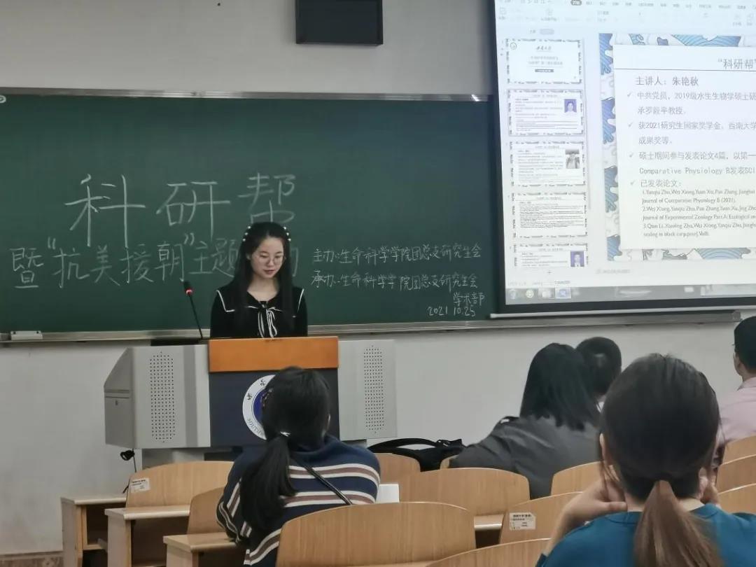 为推进研究生学术学风建设,呼吁研究生在力求学术创新的同时恪守学术道德,遵守学术规范,锻造学术品格,同时将研究生党员“我为师生办实事”落实落细落地,生命科学学院研究生团总支于10月25日下午6:30,举办研究生“科研帮”研究生学风建设主题活动,由优秀研究生代表2019级水生生物学硕士研究生朱艳秋、2019级微生物学博士研究生龚真分享文献检索的方法技巧,同时特别邀请到第七届中国国际“互联网+”大学生创新创业大赛高教主赛道金奖获得团队的负责人2019级植物学博士研究生曾俊岚分享参赛经历和项目宣讲。参与此次讲座的有学院研究生辅导员谷彩霞以及学院各年级研究生代表。