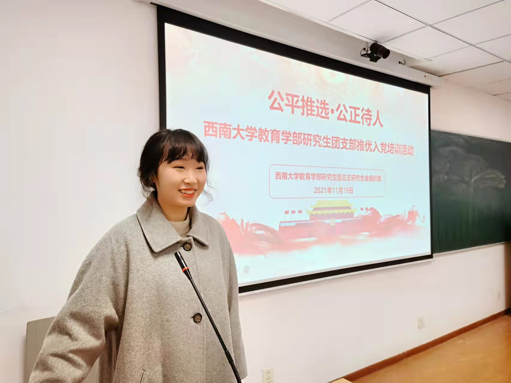 为了向党组织补充新鲜血液,加强党员队伍建设,2021年11月19日中午12:30,PA视讯教育学部研究生团总支在田家炳教育学部203教室举办了2021年推优入党培训会。