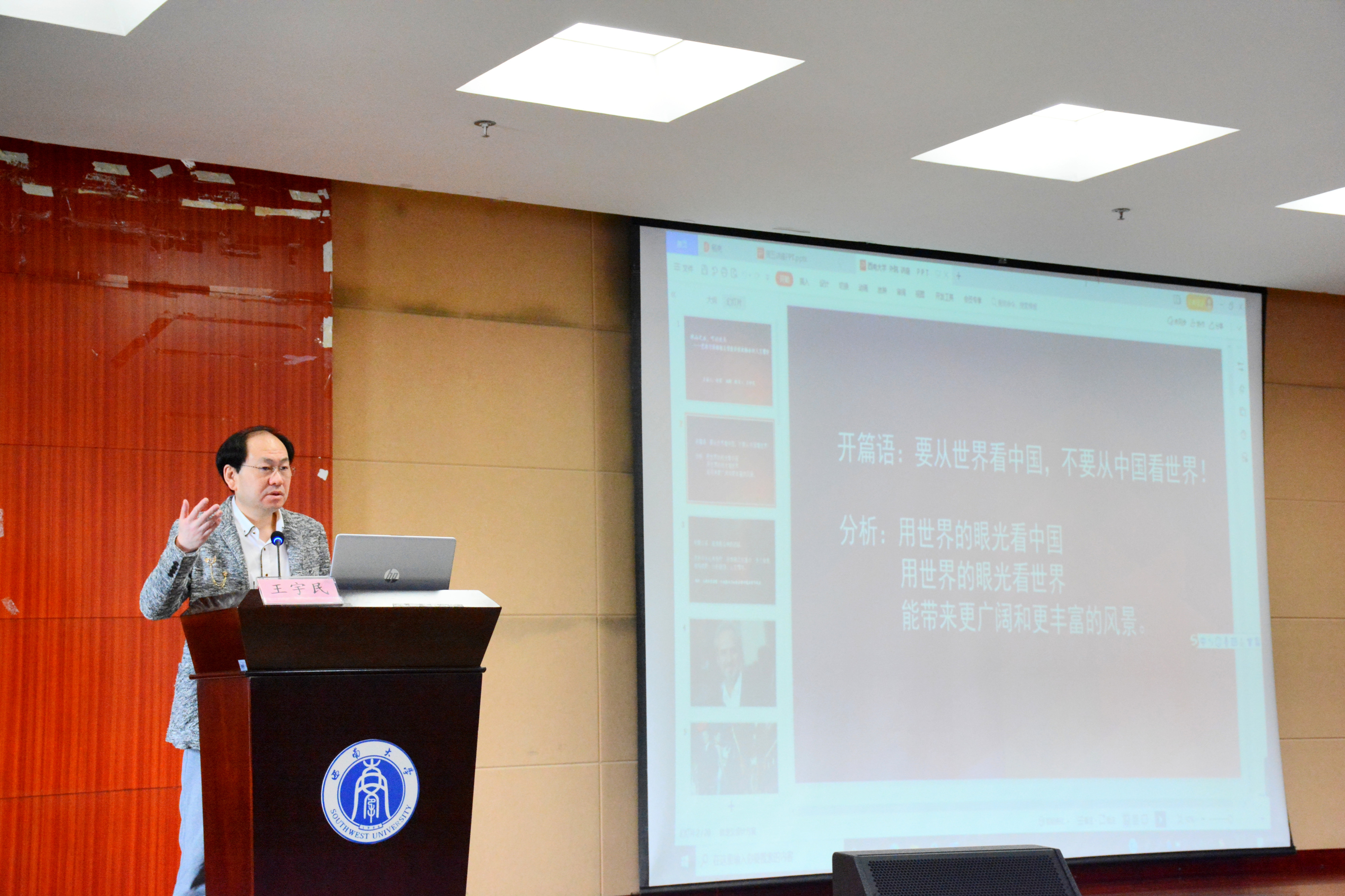 讲座伊始,王宇民老师幽默风趣地为同学们讲解了当今时代“引进来,走出去”的深刻含义,并指出“输出”不等于“灌输”,文化间的沟通交流十分必要。面向21世纪,英语专业的学生应扎实技能,争做创新型、复合型、应用型人才。