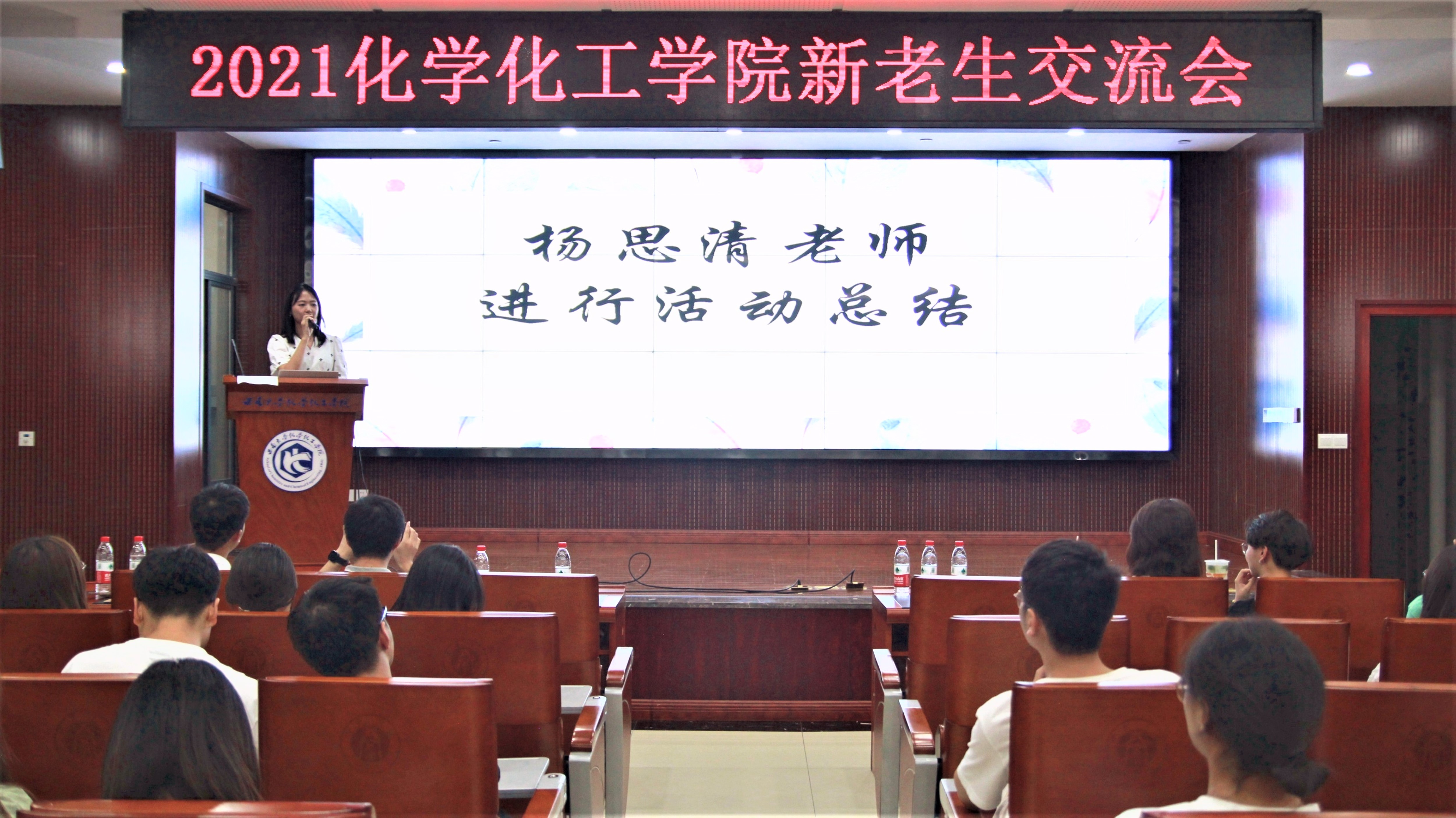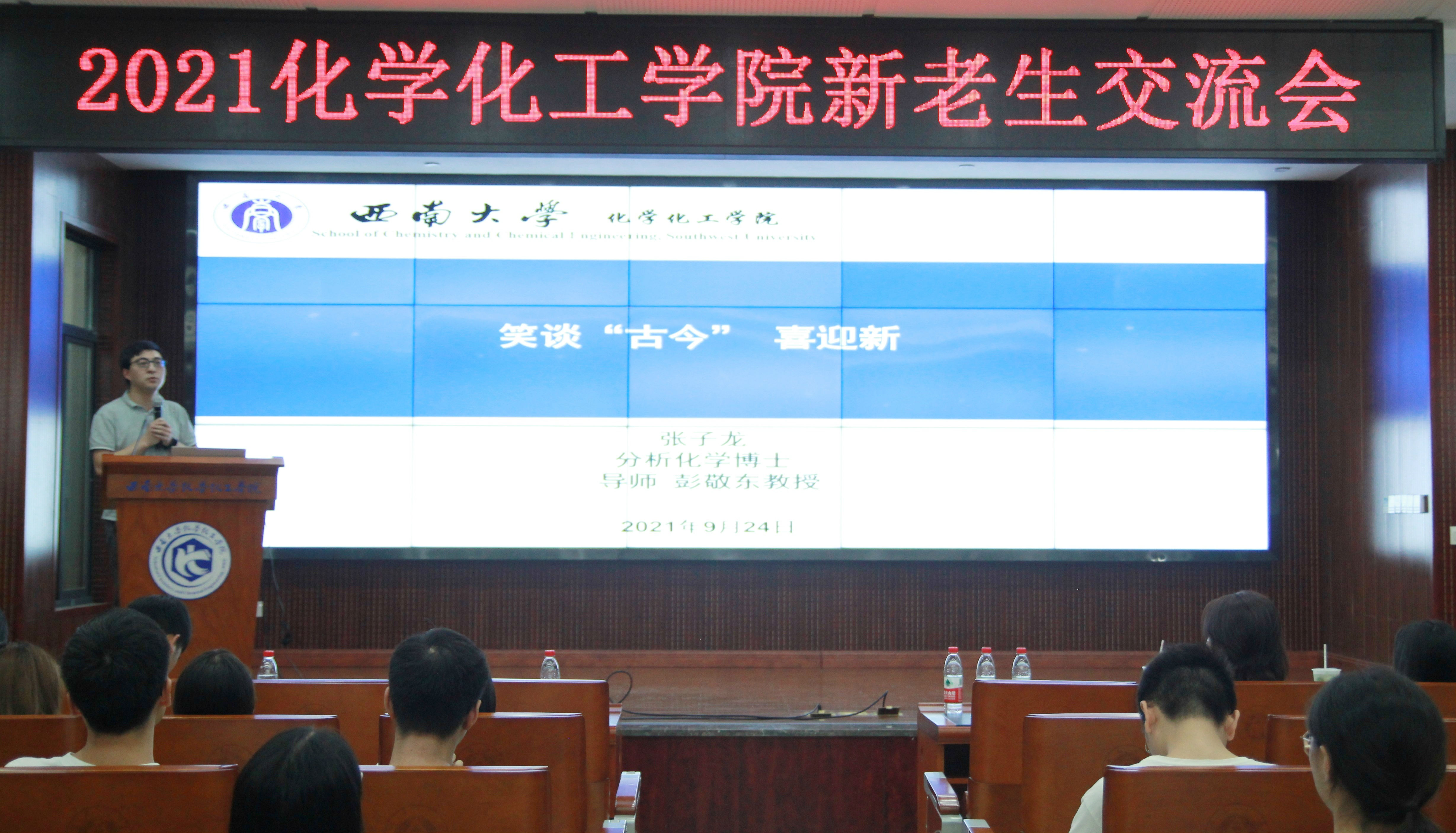 迢迢新秋夕,亭亭月将圆。2021年9月24日晚上19时,PA视讯化学化工学院2021级研究生新老生交流会在化学化工学院B114报告厅如期举行。教师教育学院学科教学(化学)硕士钟得洪,化学化工学院分析化学博士张子龙、有机化学博士黄诗雨、分析化学硕士陈怡凡、辅导员杨思清老师及全体2021级研究生参加此次交流会。