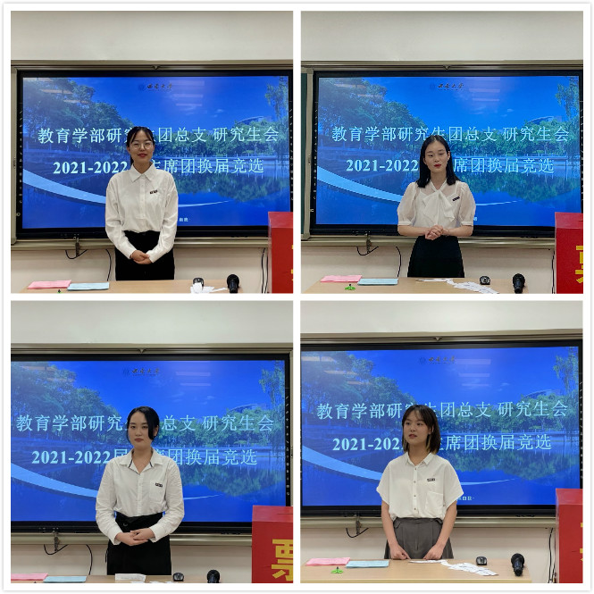 大会进行第三项议程,PA视讯教育学部研究生团总支研究生会2021-2022 届主席团开始换届竞选。本次主席团候选人员有陈卓、王瑞、沈铭和杨玥莹四位同学。此次竞选流程由自我陈述、即兴演讲、答辩三部分组成。首先,四位候选者进行自我介绍和简易述职,总结了一学期以来的工作,表达了能够胜任今后工作的决心;接着,竞选人随机抽取题目,进行即兴演讲,展现了自己的应变能力和语言表达能力;最后,团总支书记、主席团成员及学生代表现场提问,对候选者进行多方面的考察。