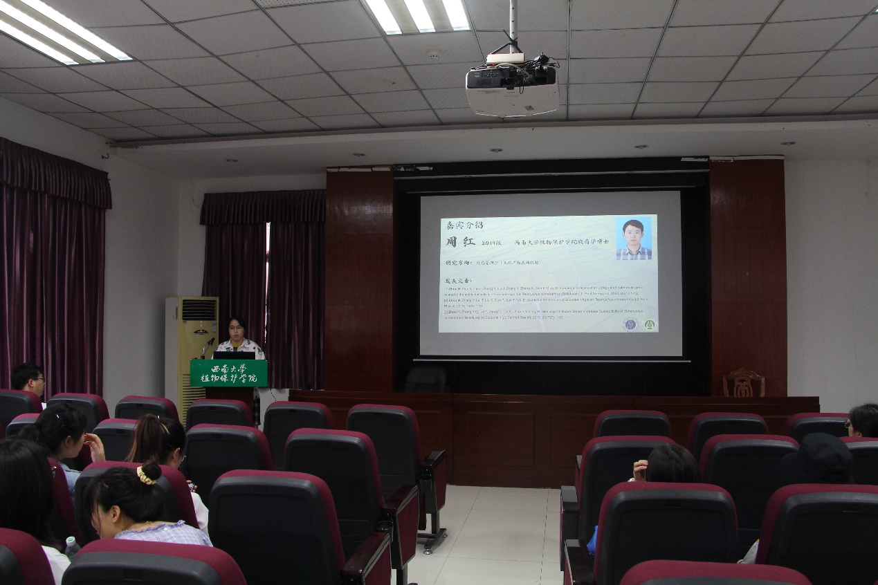 5月13日下午,植物保护学院研究生会在34教四楼报告厅举行了学期第一次硕博论坛学术交流活动。本次活动主讲人为学院2019级博士研究生周红。活动由2020级硕士研究生陈梦玲主持。学院部分研究生参加了此次活动。