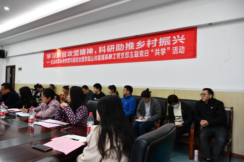 为深入学习贯彻习近平总书记在全国脱贫攻坚总结表彰大会上的重要讲话精神,3月12日下午,国家治理学院公管系教工党支部同社科处党支部在3教3328会议室开展了“学习脱贫攻坚精神 科研助推乡村振兴”主题党日“共学”活动。