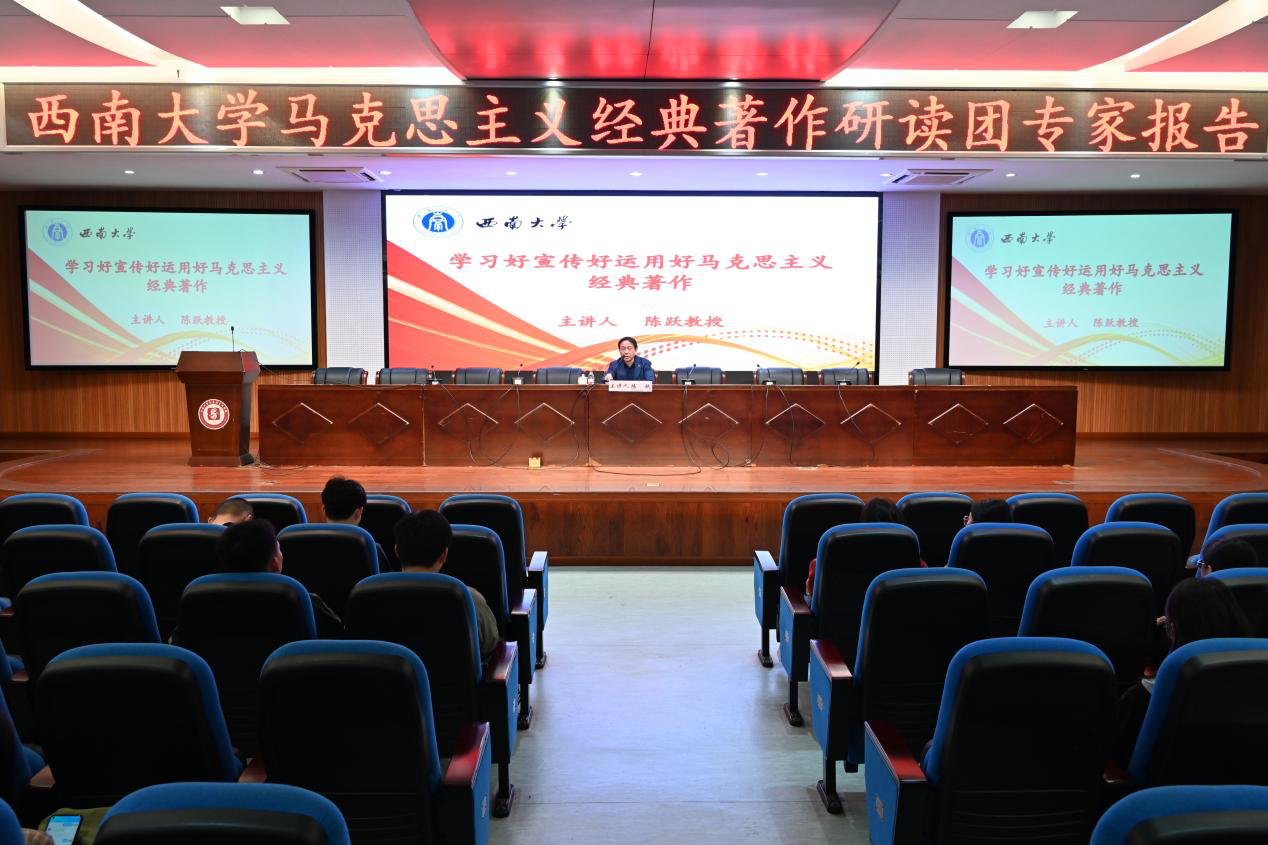 成立仪式后,研读团专家指导组组长陈跃教授为全体团员和现场同学作了马克思主义经典著作系列专题讲座第一讲:“学习好宣传好运用好马克思主义经典著作”。陈跃教授从如何学习好马克思主义经典著作出发,引用经典中的“精典”向同学们传授了阅读和学习经典著作的方法。他认为,学习马克思主义经典著作要了解其历史背景,历史地理解经典著作,重点把握每一章重点内容,确定其定位,分析其意义,领会其内在精神。之后,陈跃教授围绕如何宣传好、运用好马克思主义经典著作向同学们做了详细讲解。最后,他勉励同学们要在学习和生活实践中活学活用马克思主义经典著作的理论精髓,做一个懂马研马、信马传马的青年马克思主义者。