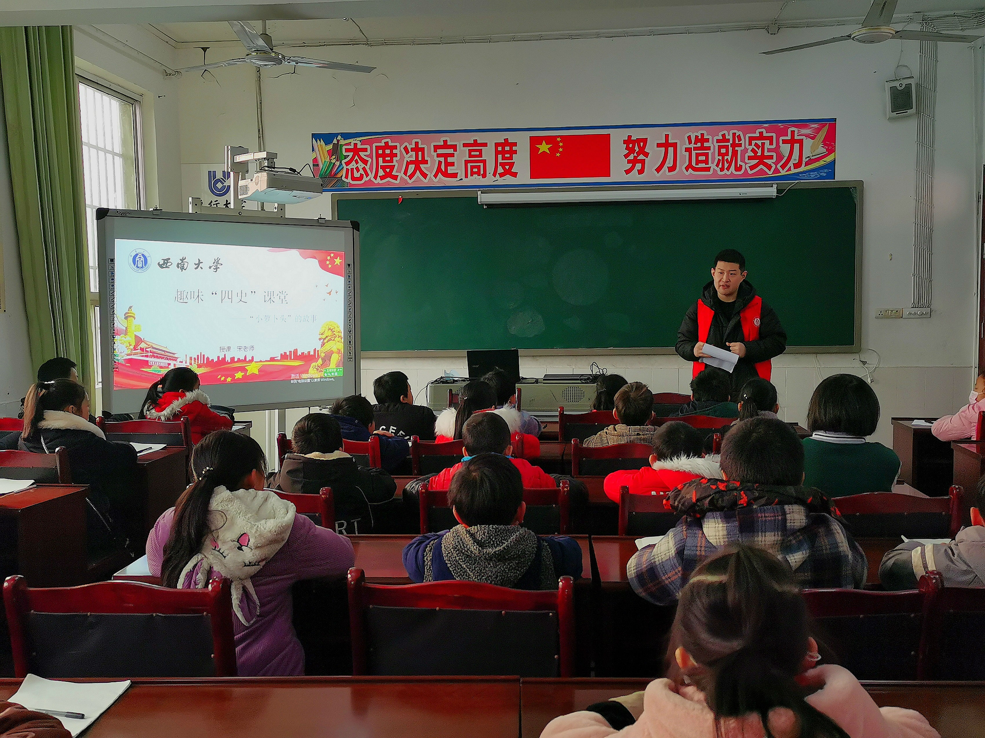 上午八点半,由志愿服务队优秀学生党员宋立主讲的“四史”课堂开始了。服务队成员宋立同学用生动活泼的语言和风趣横生的方式讲述了“小萝卜头”在敌人的监狱里艰难求生的故事。他以“小萝卜头”的求学故事为载体,为同学们展现了“小萝卜头”在监狱里不畏艰苦、努力学习的态度,同时也向学生们展现了革命烈士英勇无畏、敢于牺牲、顽强抵抗、努力报效祖国的精神,从而使学生们更加了解“四史”文化,进而加强了对同学们的思想教育。最后同学们纷纷表达自己听完故事后的感受,有的同学感受到了勇敢的品质,有的同学感受到了要好好学习,还有的同学感受到了保卫祖国、不怕牺牲的精神。同学们都感受到了“四史”文化,思想上也得到了进一步的提升,更加明白要不断学习、刻苦奋斗,努力为国家做出自己的贡献!