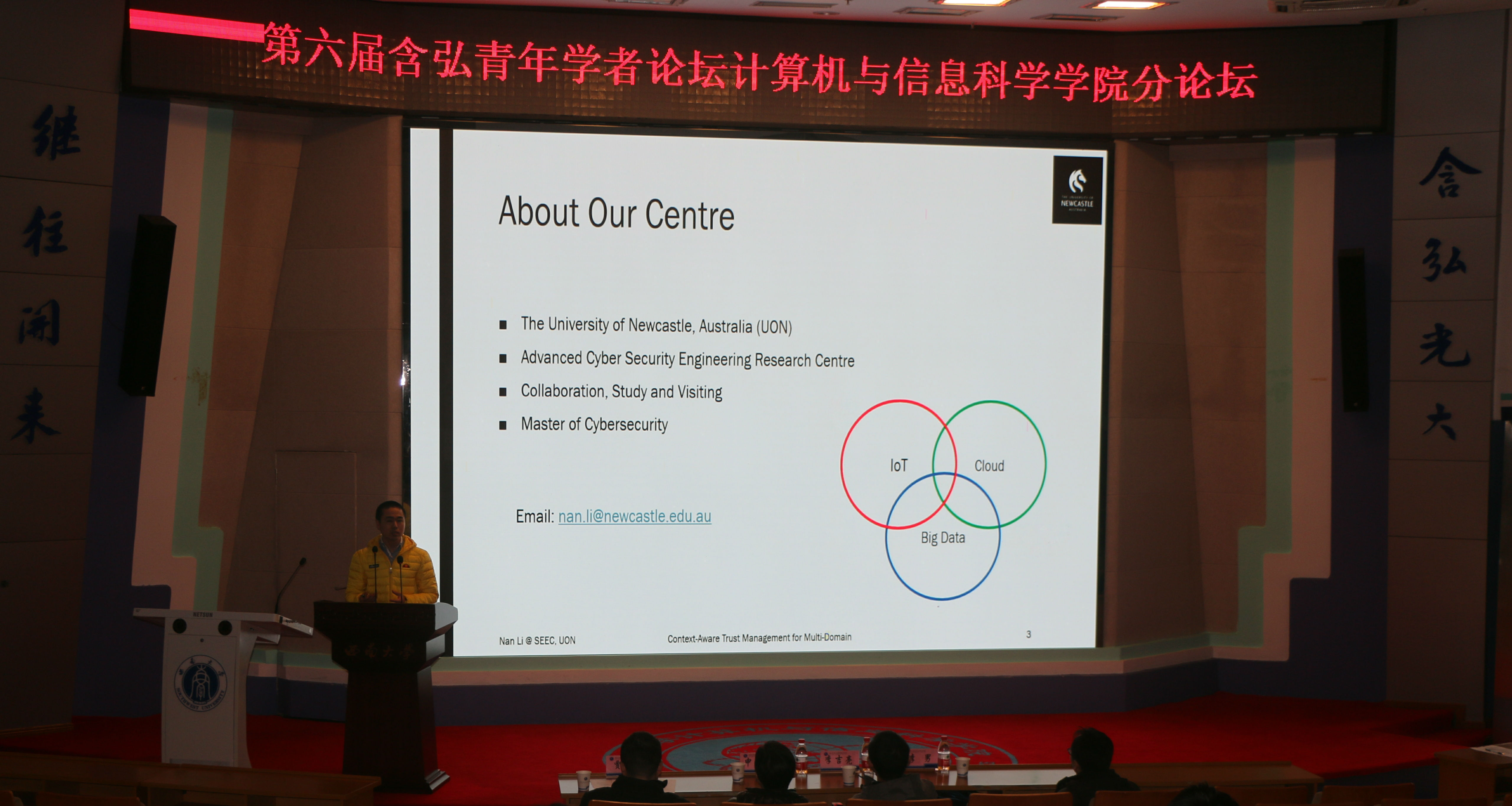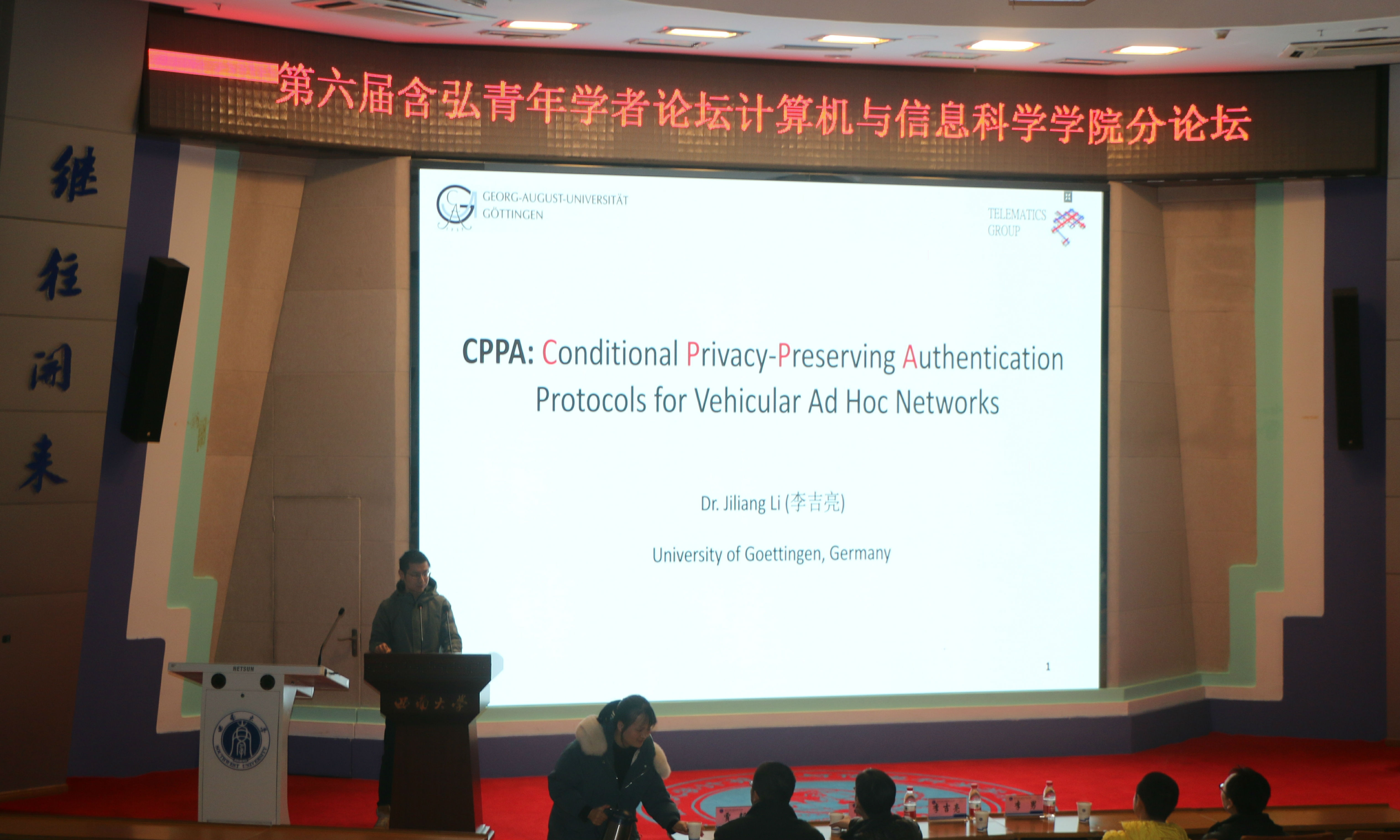 12月26日下午,博士毕业于加拿大阿尔伯塔大学电气与计算机工程系的申映华学者,获得德国哥廷根大学数学与计算机学院自然科学博士学位的李吉亮学者以及博士毕业于澳大利亚卧龙岗大学的李男学者在PA视讯计算机与信息科学学院一楼学术报告厅为计算机与信息科学学院师生分别作了题为“模糊聚类算法:开发与分析”、“车联网中条件性隐私保护认证协议的研究”和“基于上下文感知的信任管理系统以及在物联网中的应用”的专题报告,来自学院的百余名师生聆听报告。