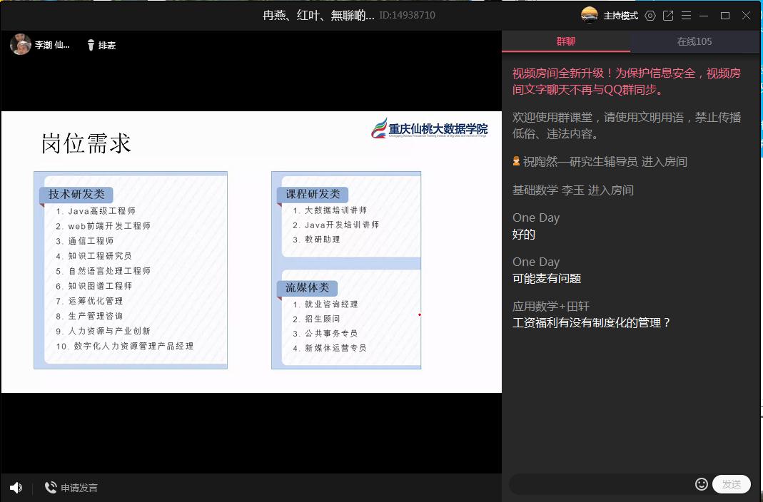 双选会于下午1点整正式开始,共有黄冈师范学院、巴川中学、重庆仙桃大数据学院、重庆新东方公司等9家用人单位和一百余名本科生、研究生参会,用人分别通过直播、PPT介绍、在线答疑等方式进行了招聘宣讲,数统院2020届毕业生辅导员唐海、祝陶然为用人单位详细介绍了学院的各方面情况,各毕业生就自己关心的问题进行了咨询提问,双选会网络会场氛围热烈、互动积极。
