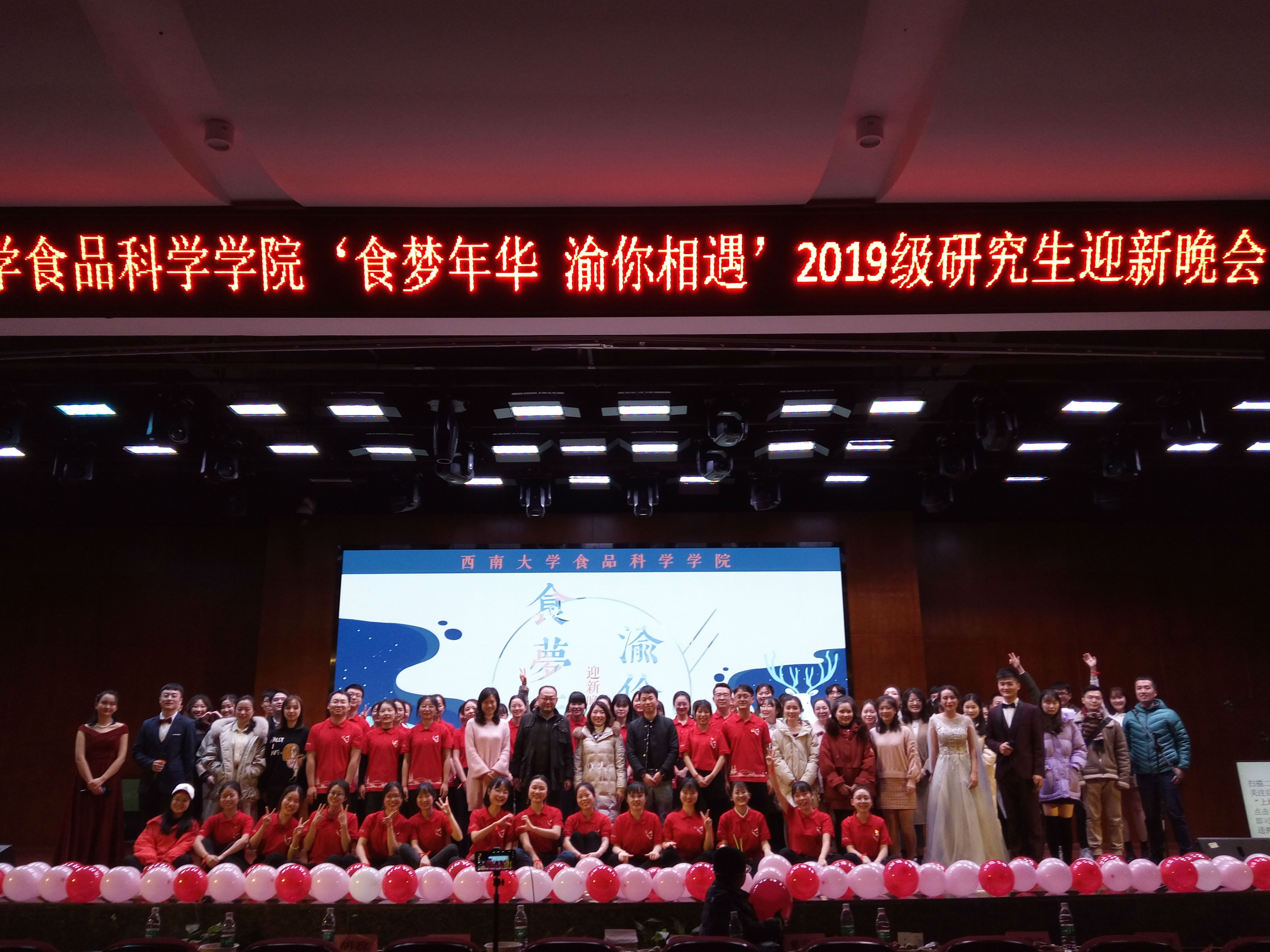 2019年12月22日晚7点,“食梦年华,渝你相遇”——2019级研究生迎新晚会在第二学生活动中心107会议厅顺利举办。食品科学学院张宇昊院长、刘秋艳副书记、研究生辅导员胡孜老师以及任丹老师、周韵老师、戴宏杰老师等出席,2019级全体研究生参加。