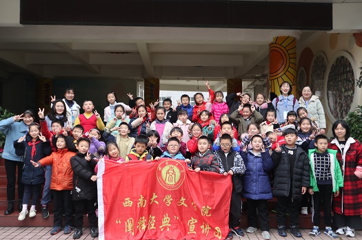 文学院第十届国学宣讲团分别于12月18日和12月25日两次走进北碚区朝阳小学三年级(3)班进行本学期的国学宣讲团走进校园活动。本次活动秉持着“在孩子们心中播撒一颗国学种子”的信念,让国学启蒙走进校园,蕴化于心。第一次宣讲内容主要是《世说新语》中“雪夜访戴”和“咏雪”两则小故事以及《孟子》中“生于忧患,死于安乐”的讲解。为了加深小朋友们对中华优秀传统文化的了解,文学院第十届国学宣讲团再次走进朝阳小学为小朋友们解读《三字经》与《孙子兵法》两部传统经典作品。