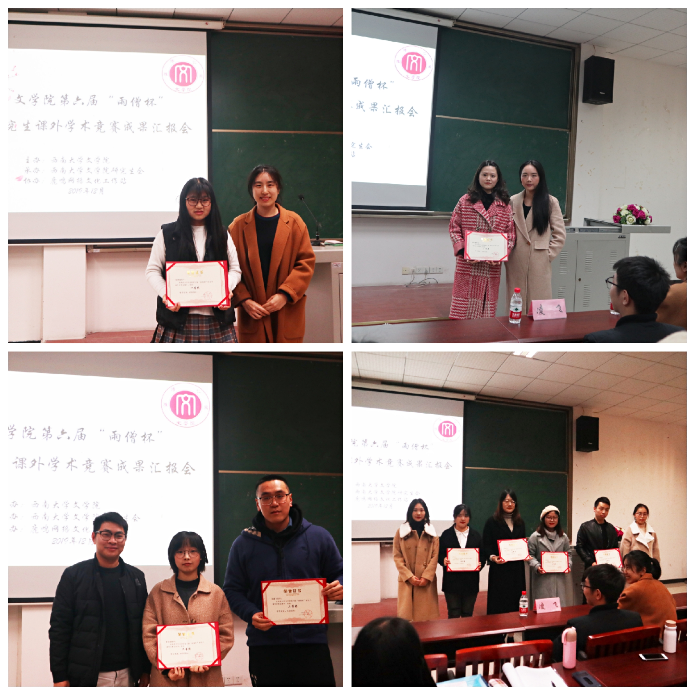 12月6日下午15点,由文学院主办,文学院研究生会承办,鹿鸣网络文化工作站协办的第六届“雨僧杯”研究生课外学术竞赛颁奖仪式暨成果报告会在雨僧楼209教室成功举办。