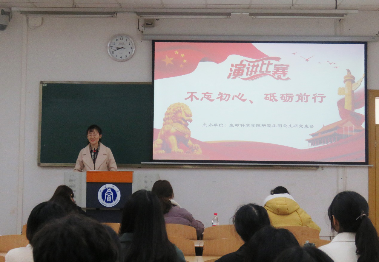 为深入学习贯彻习近平总书记庆祝中华人民共和国成立70周年系列重要讲话精神,丰富研究生的校园文化生活,增强研究生坚定理想信念的决心和信心。12月12日下午3点,由生命科学学院团总支研究生会主办的以“不忘初心、砥砺前行”为主题的研究生第七届演讲比赛初赛在第8教学楼504顺利举行。担任此次比赛的评委有研究生第六届数理化生讲课比赛获奖者万彬娜、韩秋霞、杨治华,此次比赛面向生命科学学院全体研究生。