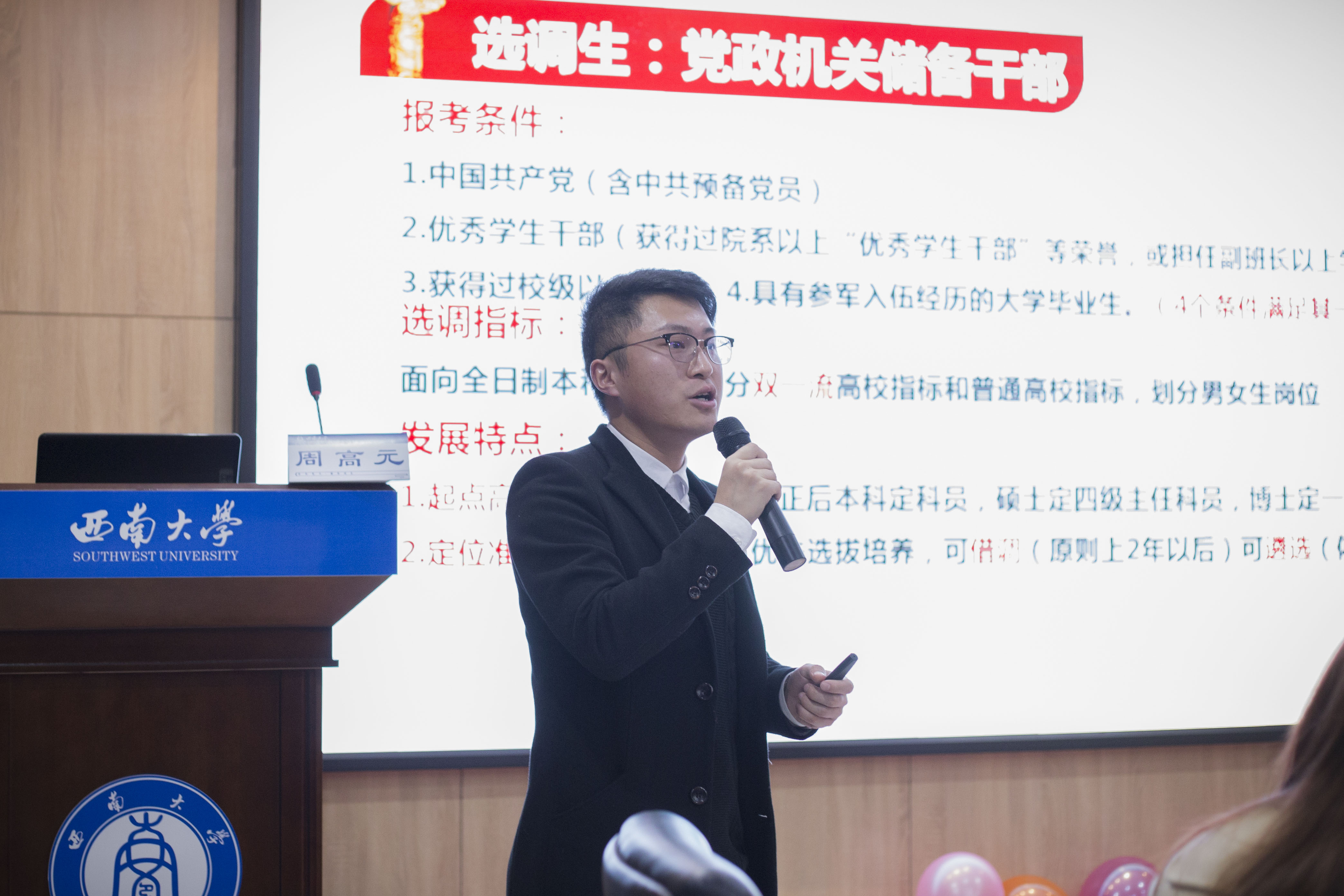 求职经验分享会分为两期举办,本期邀请了2019届重庆市定向选调生周高元和签约华为运营商客户经理的许冰宇。其中周高元分别从揭秘选调、行测点睛、申论题要、选调信息四个方面分享了有关重庆市定向选调生的内容,详细介绍了选调生的报考条件,选调岗位信息以及答题技巧。