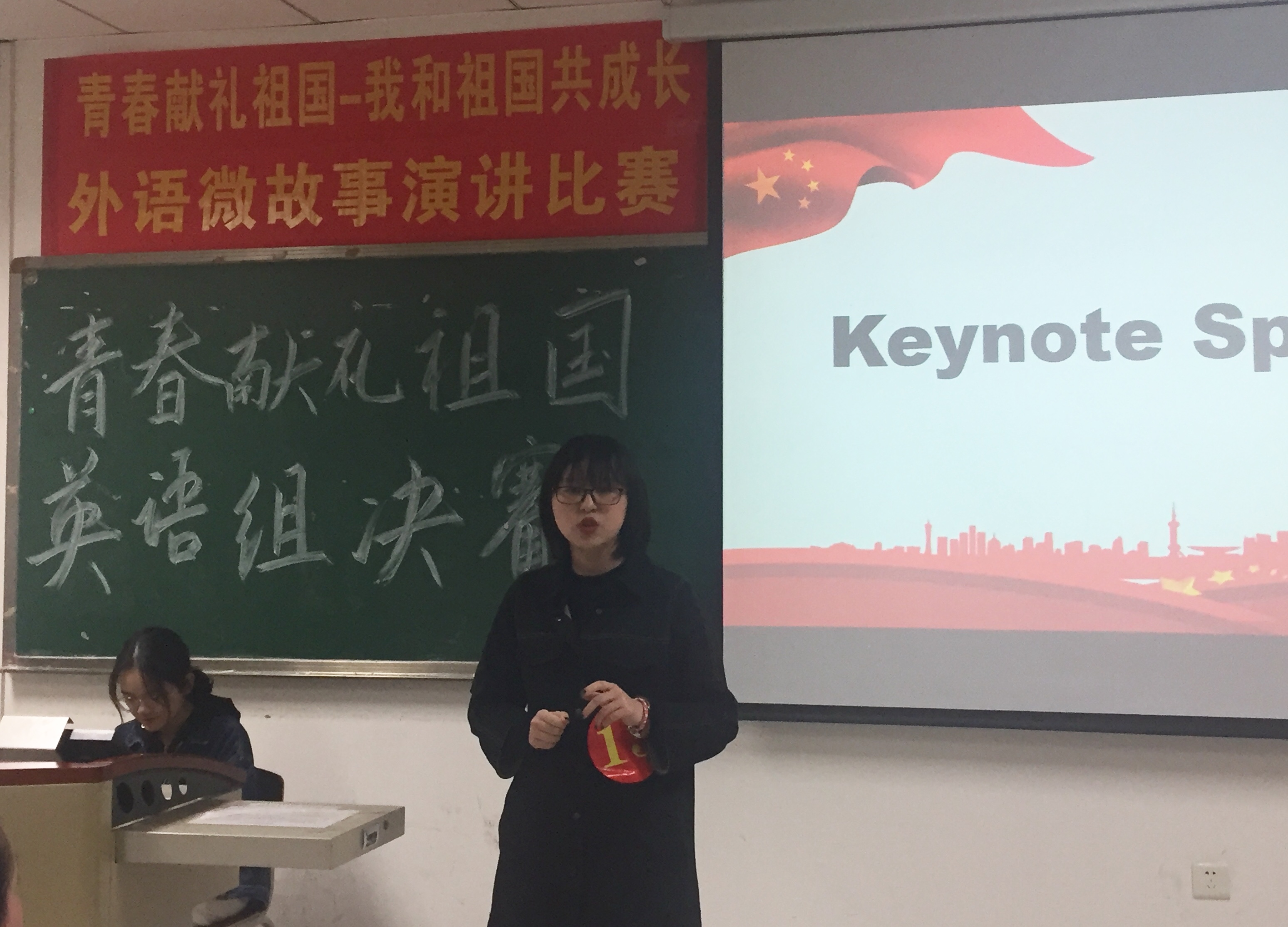 峥嵘七十载,悠悠中华情。为热烈庆祝中华人民共和国成立70周年,PA视讯外国语学院于2019年10月14日至22日举办了“青春献礼祖国—我和祖国共成长”外语微故事演讲比赛。此次比赛由中国共产党PA视讯外国语学院委员会主办,PA视讯外国语学院团委学生会及各年级承办。来自英语、俄语、日语、德语专业的95名选手,积极把学习与演讲比赛实践相结合:用一段岁月,刻骨铭心;用一种精神,穿越历史;用一段旅程,永葆生机。10月18日晚上7点,“青春献礼祖国—我和祖国共成长”英文微故事演讲比赛决赛于外国语学院512教室顺利举行。担任英语组决赛的评委有英语系教师秦语甜、周玉佳以及外籍教师Andrew Avitt。部分本科生及研究生到场观摩决赛。
