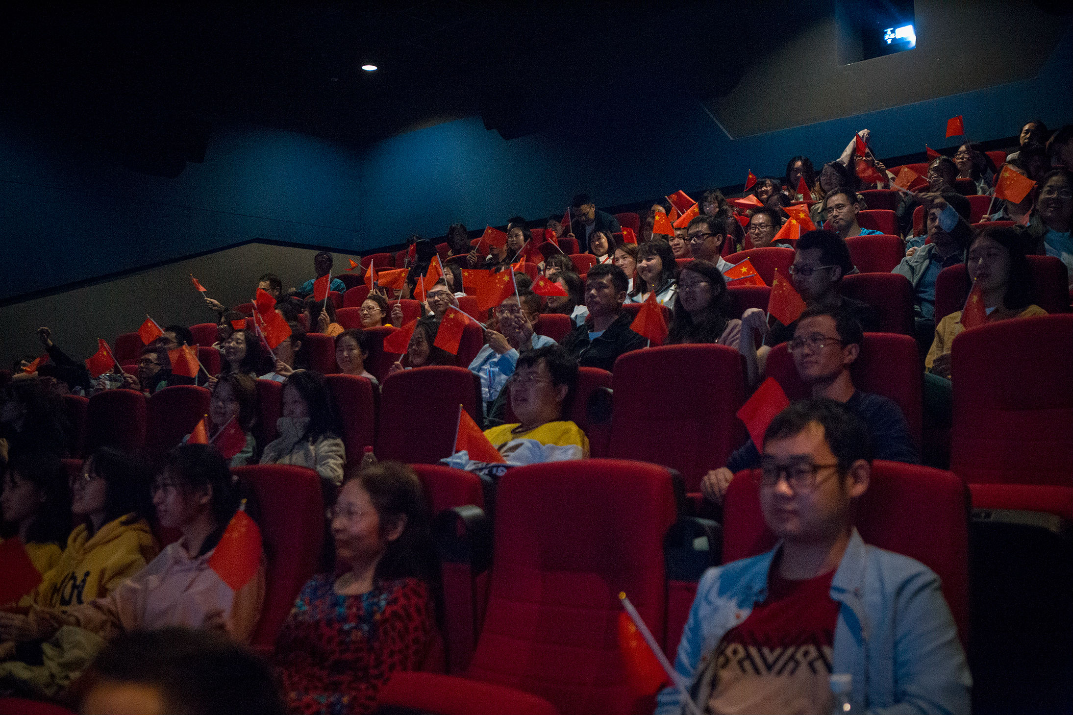 《我和我的祖国》描述了祖国70年发展变迁,从新中国成立的第一面红旗冉冉上升,到女排奥运会首次夺冠,再到香港回归、北京奥运会、神州十一号飞船返回成功着陆、纪念抗战胜利70周年阅兵式等7个祖国经历的历史瞬间。观影过程中,老师和同学们产生了代入感和共鸣,既有笑声,也有泪水,随着这7个历史瞬间一起,以普通人的视角观察、感受并参与这个时代。电影结束时,大家情不自禁地挥动手中的小国旗,合唱歌曲《我和我的祖国》。