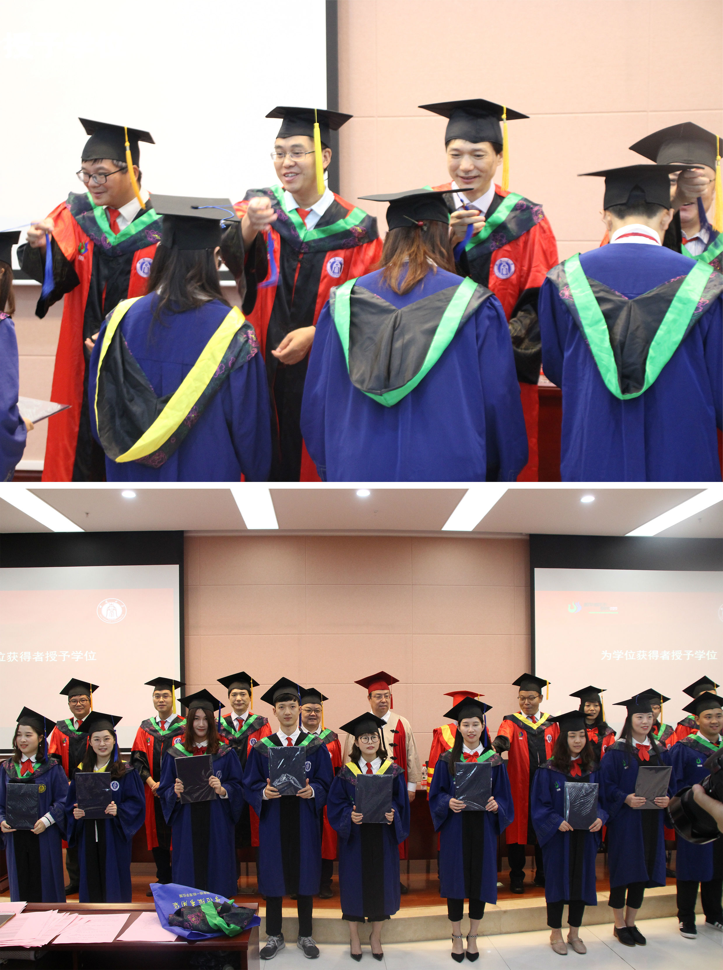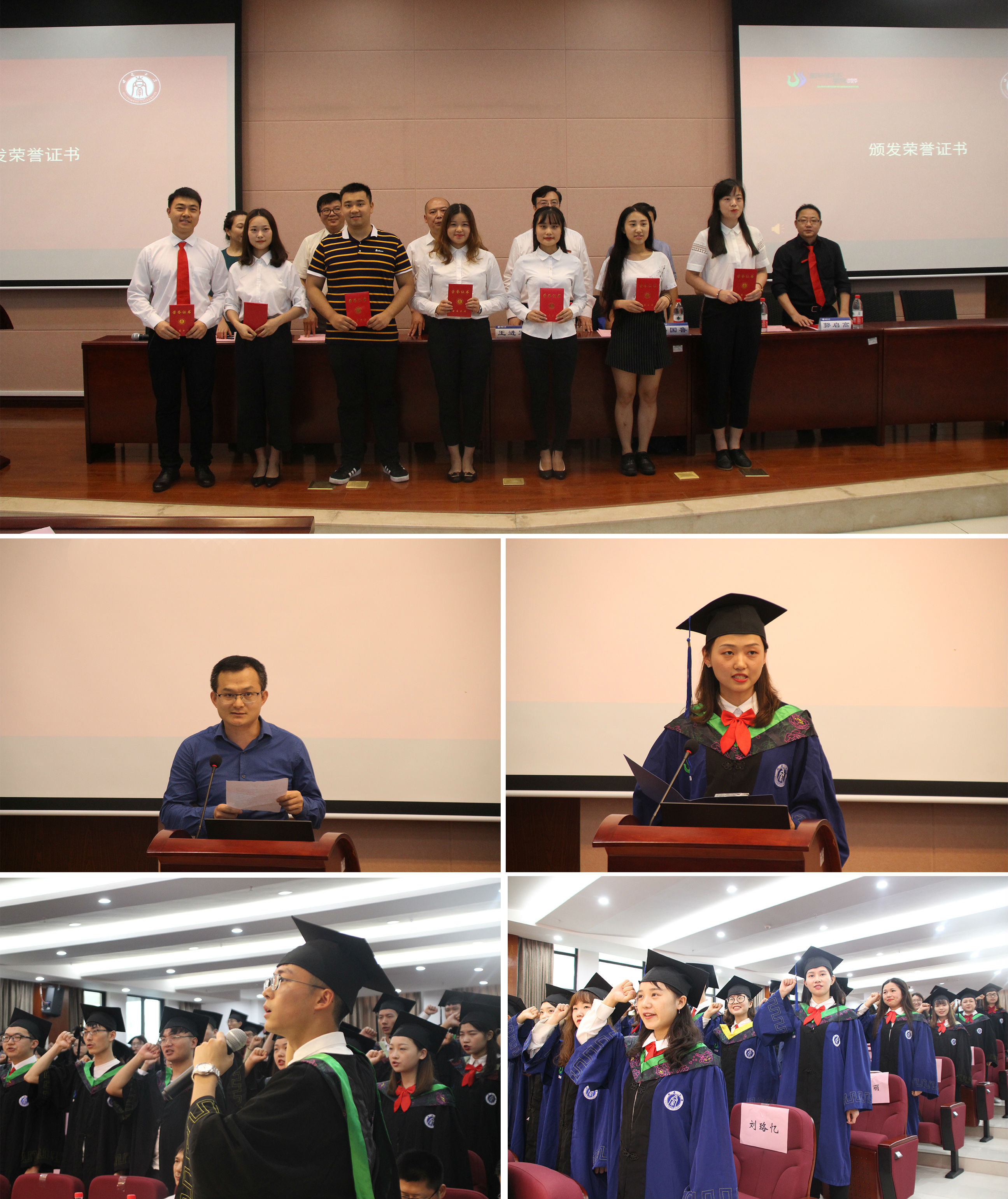 梁院长宣读学位授予决定,毕业生怀着激动而喜悦的心情走向主席台接受领导授予的学位证书并合影留念。
