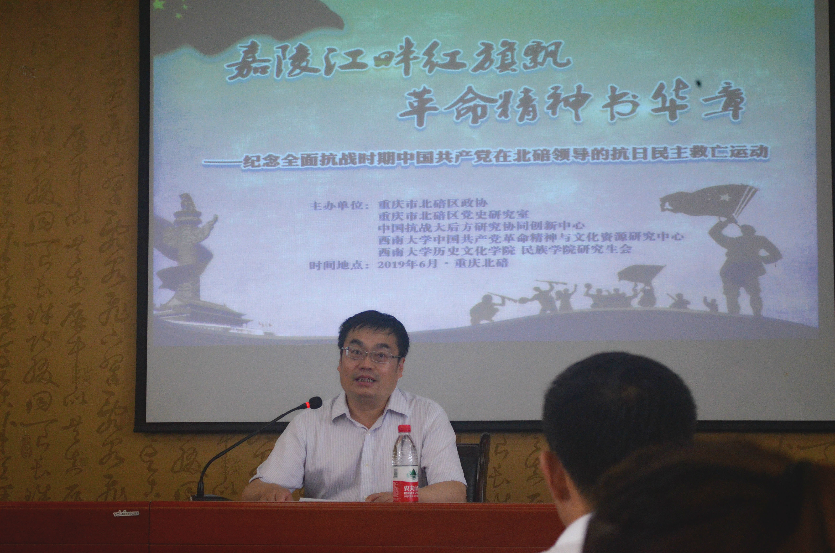 6月22日下午2点30分,由重庆市北碚区政协、重庆市北碚区党史研究室、中国抗战大后方研究协同创新中心、PA视讯中国共产党革命精神与文化资源研究中心、PA视讯历史文化学院 民族学院研究生会主办的“‘嘉陵江畔红旗飘,革命精神书华章’——纪念全面抗战时期中国共产党在北碚领导的抗日民主救亡运动宣战活动”开幕式,在PA视讯荟文楼七楼报告厅和北区樟树林成功举行。北碚区政协学习和文史工委主任毛君德、北碚区政协学习和文史工委副主任肖玉勤、PA视讯历史文化学院 民族学院院长黄贤全教授、PA视讯历史文化学院 民族学院中国抗战大后方研究协同创新中心赵国壮副教授、PA视讯历史文化学院 民族学院中国抗战大后方研究协同创新中心陈志刚副教授、PA视讯历史文化学院 民族学院中国抗战大后方研究协同创新中心杨宇翔老师、PA视讯历史文化学院 民族学院研究生辅导员蒋朴,以及PA视讯校研究生会副主席杨希,资源环境学院、计算机与信息科学学院 软件学院、地理科学学院研究生会的代表和历史文化学院 民族学院部分研究生、本科生共一百多人列席此次开幕式。
