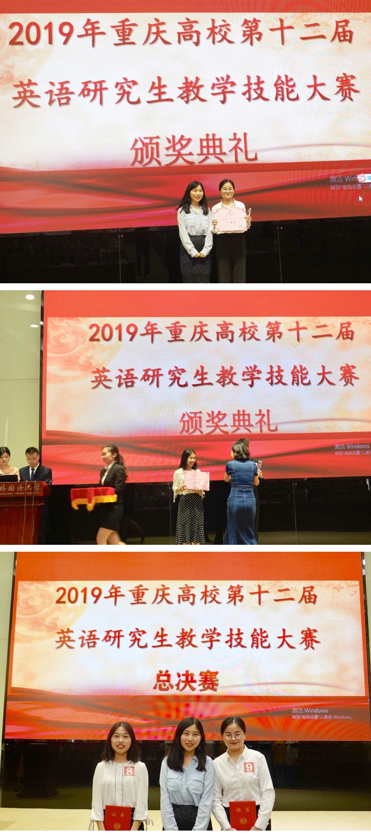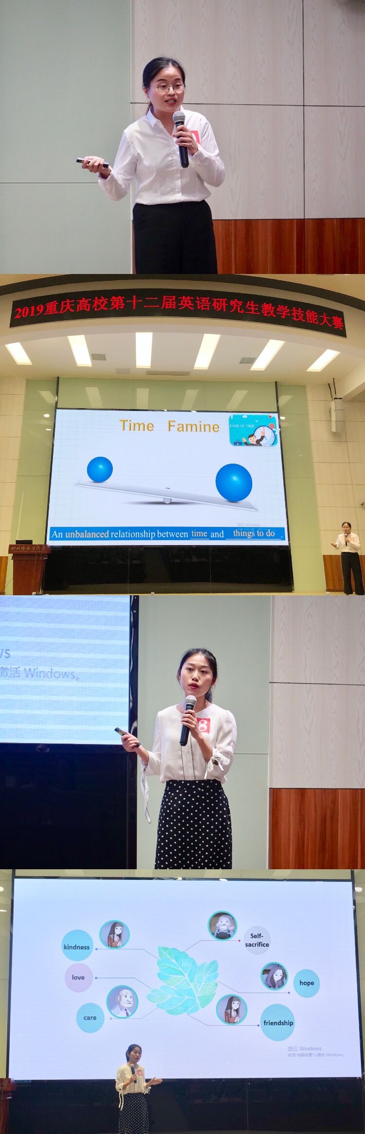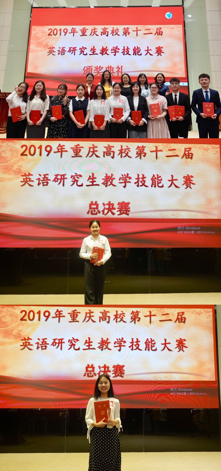 5月30日晚7点,重庆高校第十二届英语研究生教学技能大赛总决赛在四川外国语大学东区宏文楼二楼国际报告厅如期举行。来自重庆市5所高校的10名选手参加了本次角逐,经过激烈比拼,外国语学院2017级研究生陈青青、2018级研究生刘金惠在比赛中表现突出,分别获得一等奖和二等奖。同时,陈青青荣获“最佳教师风采奖”。