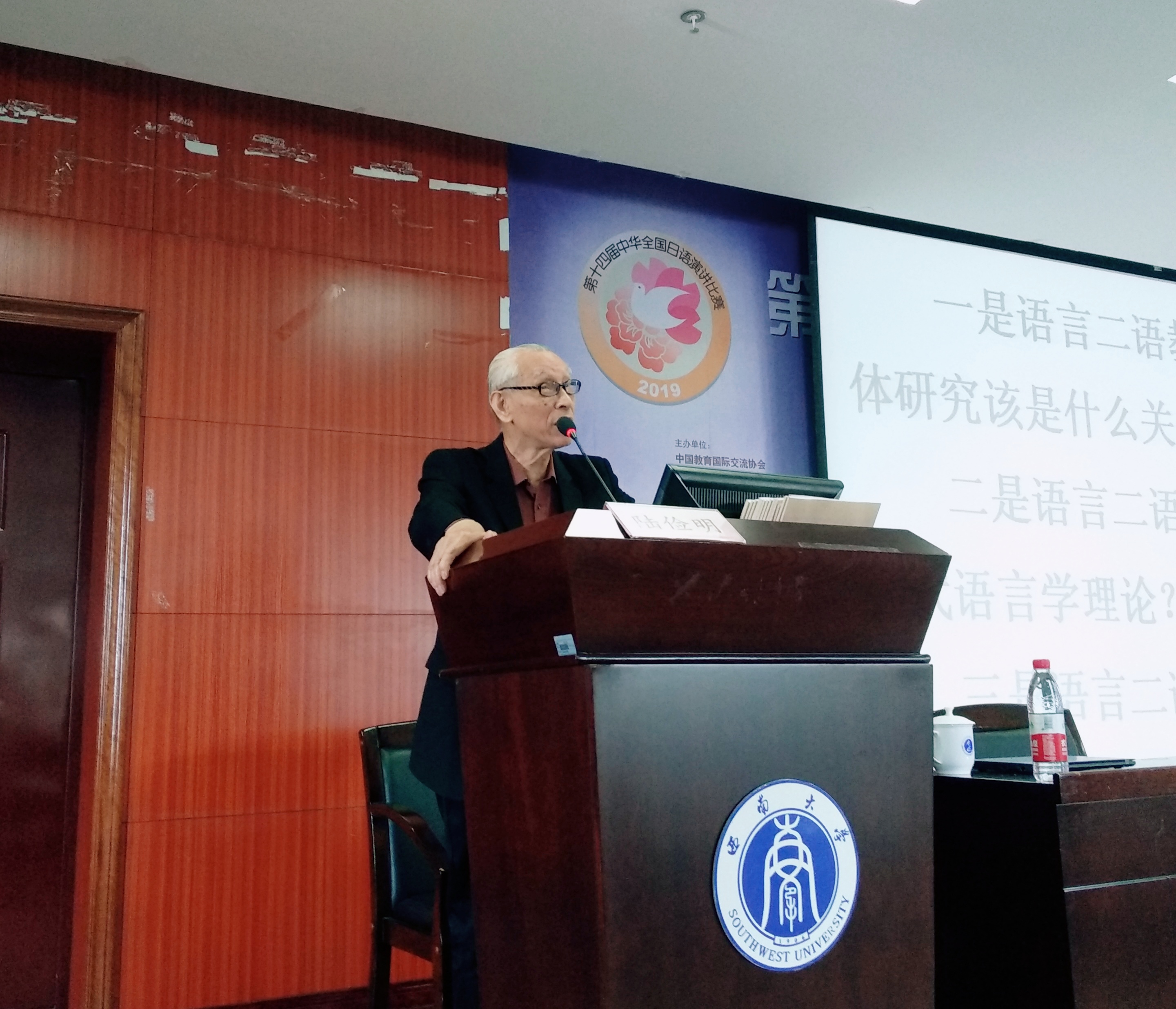 10点30分,陆俭明教授做了题为“语言二语教学与语言本体研究的接口问题”的专题讲座。首先,陆俭明教授指出,这里所说的“语言二语教学”包括汉语教学和各种外语教学。然后,陆教授提出了三个问题以引发听众思考,并由此将讲座内容娓娓道来。
