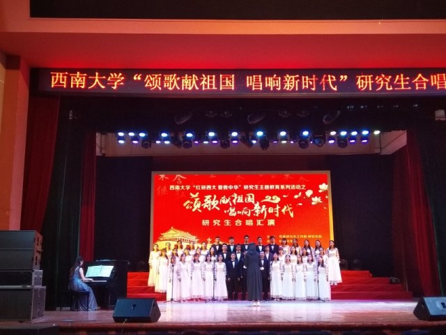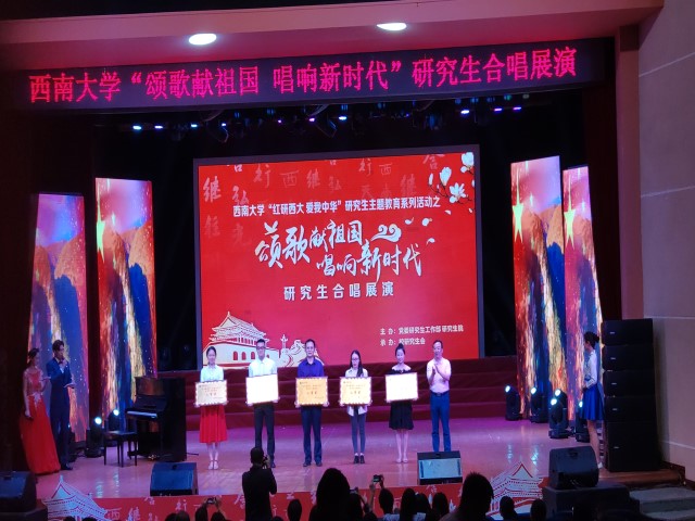 为传承五四精神,讴歌中华人民共和国成立70周年,5月15日晚七点,由PA视讯党委研究生工作部及研究生院主办,校研究生会承办的PA视讯“颂歌献祖国 唱响新时代”研究生合唱展演在光大礼堂顺利举行。校党委副书记潘洵,党委宣传部部长李荣华,党委研究生工作部部长尹晓东,研究生院院长赵国华出席活动。动物科技学院赵永聚院长和研究生辅导员李洋参加此次活动。